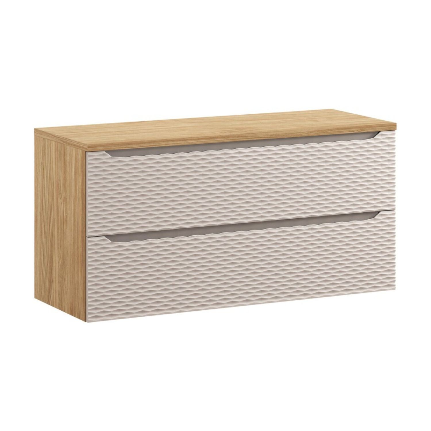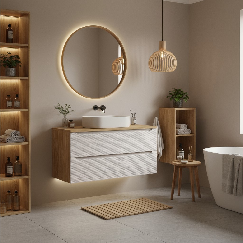 Verleihen Sie Ihrem Badezimmer mit dem Waschtischplan YOKA 120 cm eine natürliche und raffinierte Note. Seine helle Eichenfertigstellung und sein klares Design machen ihn zum zentralen Element Ihres Raumes, ideal für das Aufstellen einer oder zwei Becken, während er eine warme und moderne Atmosphäre schafft.
