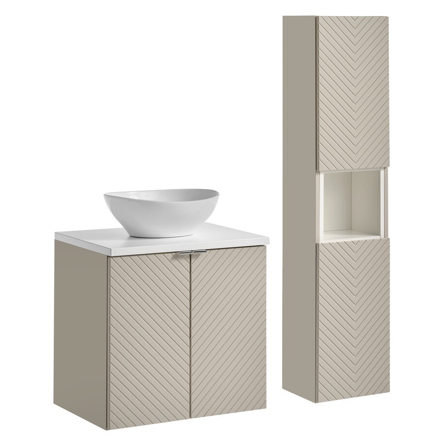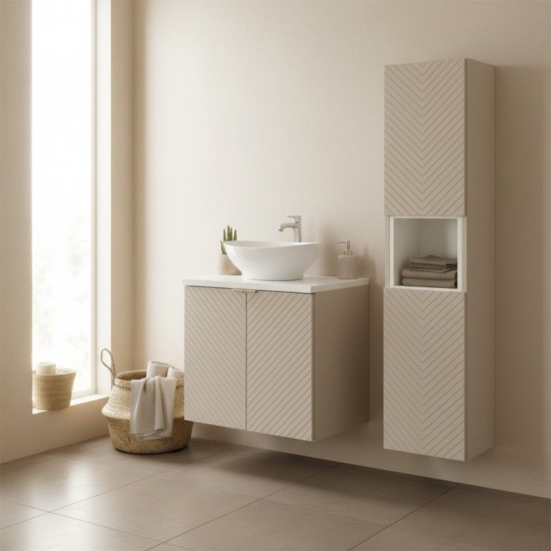 Créez une salle de bain complète, moderne et harmonieuse avec cet ensemble AOKI 60 cm. Il comprend un meuble sous vasque à portes, un plan vasque blanc, une vasque ronde blanche à poser, une colonne de rangement haute ainsi qu’une étagère cubique intégrée dans la colonne. L’association du beige mat et du blanc lumineux reflète parfaitement l’élégance douce du style japandi.
