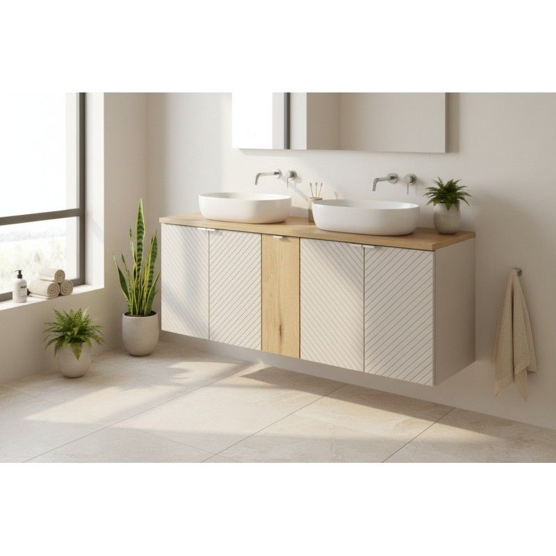 Optimieren Sie den Raum in Ihrem Badezimmer mit diesem Set AOKI 140 cm, bestehend aus drei Unterschränken und einer Waschtischplatte in Holzoptik. Das Set bietet große Modularität und umfangreichen Stauraum, während es einen modernen und beruhigenden Japandi-Stil beibehält.