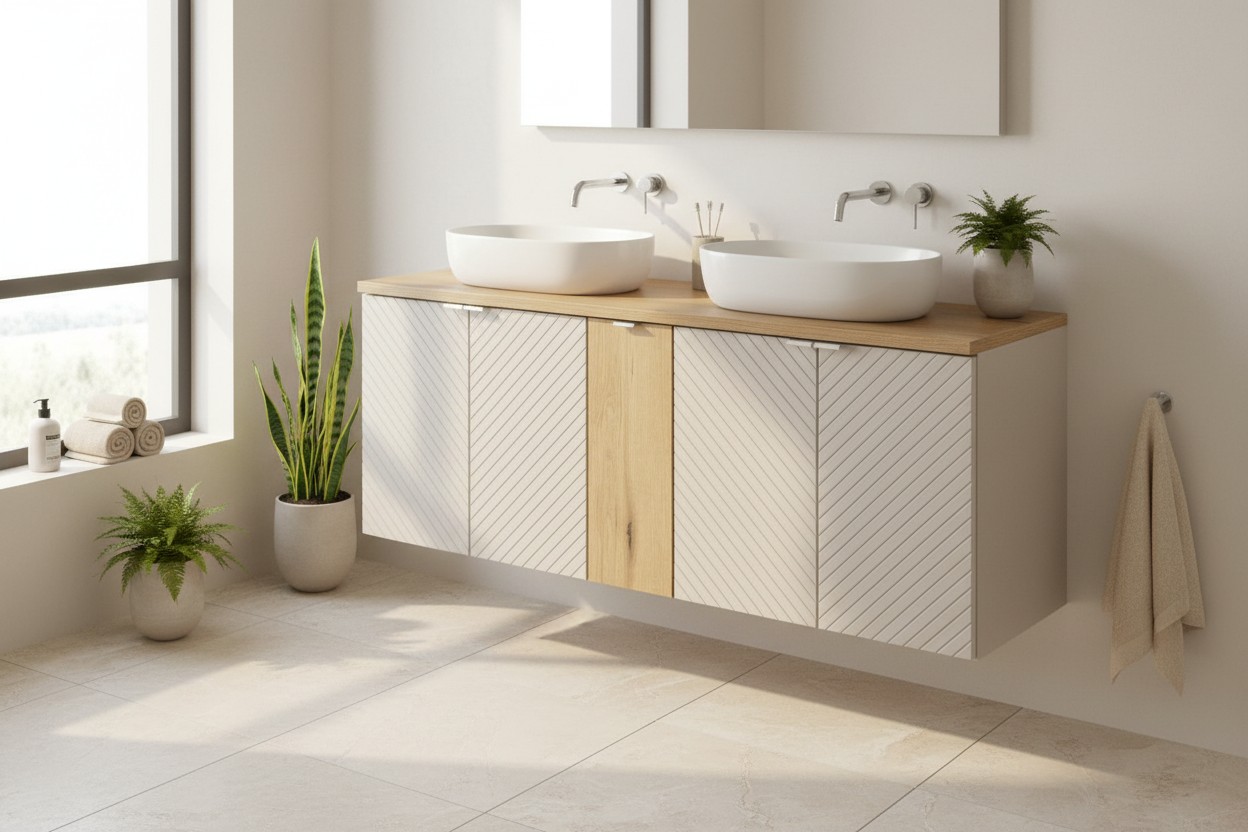 Seine matt Kaschmir Oberflächen kombiniert mit heller Holzoptik schaffen eine zenartige und warme Atmosphäre. Gefertigt aus hochwertigen Spanplatten und MDF, gewährleistet dieses Set Stabilität, Langlebigkeit und ausgezeichnete Feuchtigkeitsresistenz.