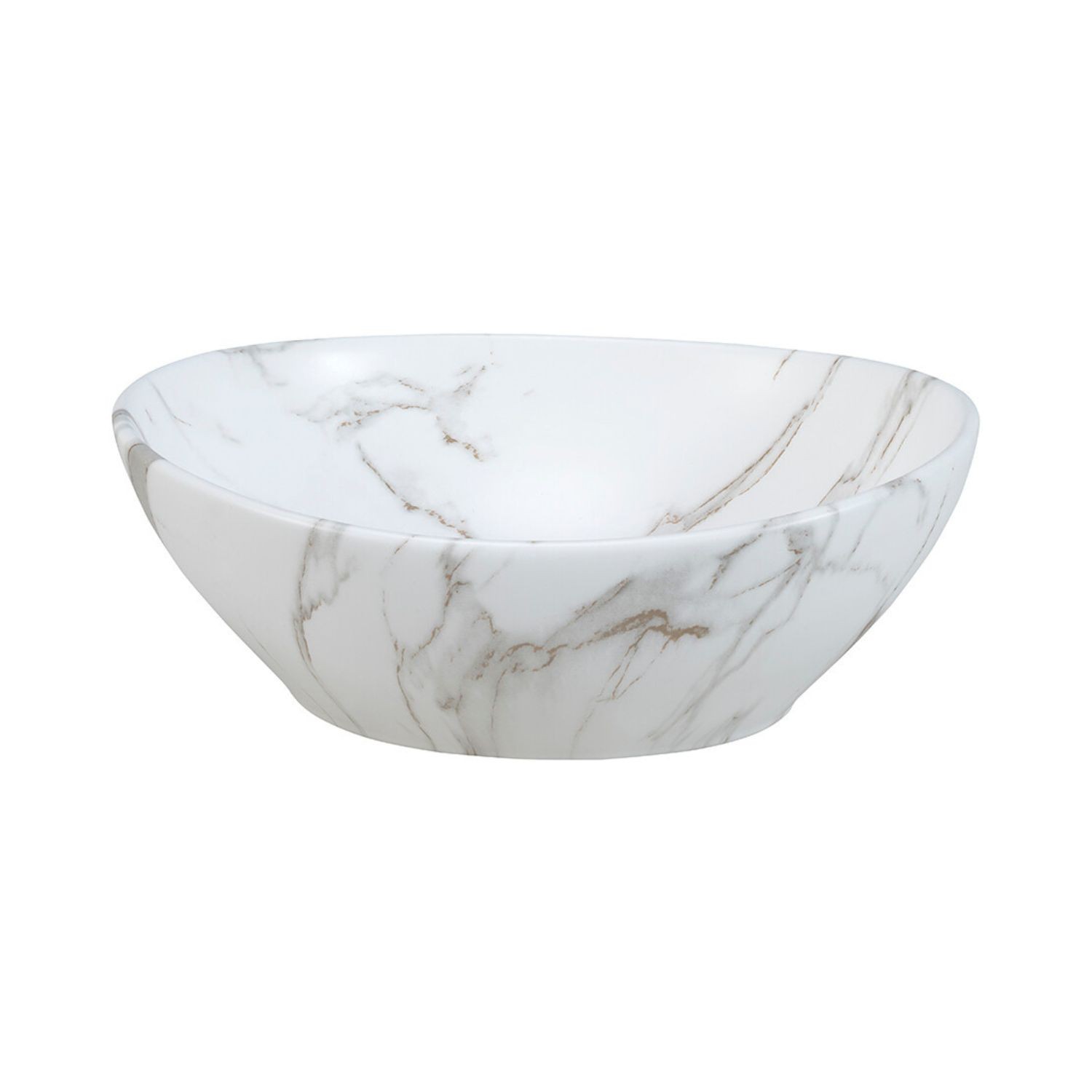 Die zwei asymmetrisch ovalen Aufsatzbecken in Marmoroptik bieten Raffinesse und Originalität und gewährleisten gleichzeitig optimalen Komfort für den täglichen Gebrauch zu zweit. Der 120 cm Spiegel mit zwei LED-Lampen sorgt für ausgezeichnete Helligkeit und veredelt das Gesamtbild.