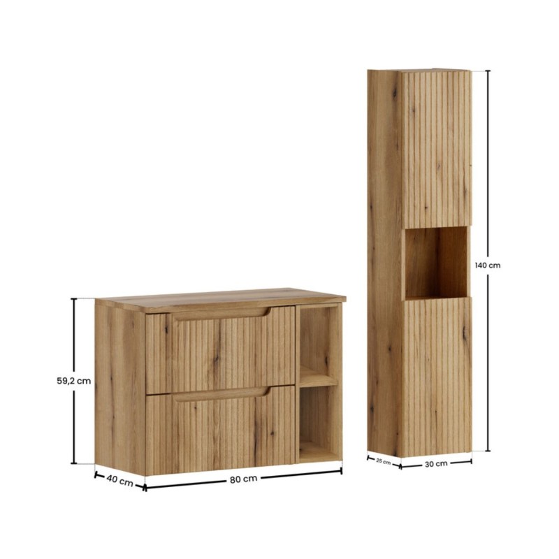 | dimensions_des_elements_(en_cm) | 1 meuble sous vasque 2 tiroirs : 60x57x39 + 1 meuble sous vasque avec niches visibles : 20x57x38 + 1 plan pour vasque : 80,6x2,2x40,5 + 1 colonne : 30x140x25 |