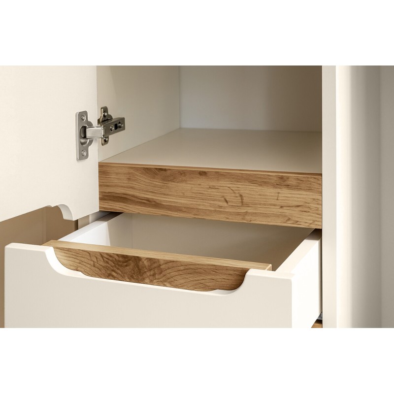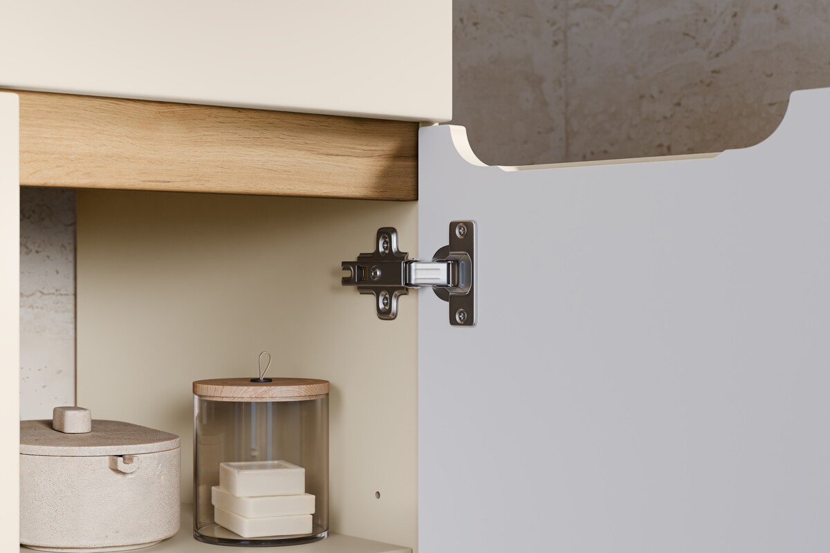 Son coloris cachemire associé à un aspect chêne clair crée une ambiance chaleureuse et naturelle, idéale pour une salle de bain apaisante et tendance.