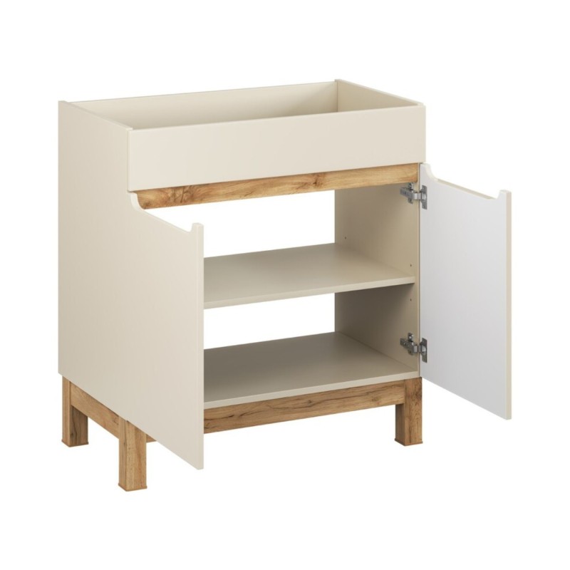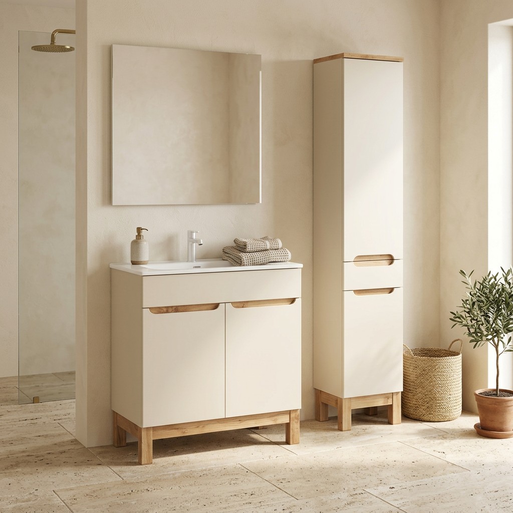 Son coloris cachemire associé à un aspect chêne clair crée une ambiance douce et naturelle, parfaite pour une salle de bain contemporaine et apaisante.