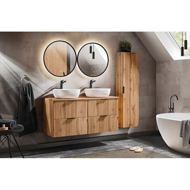 Optimieren Sie Ihr Badezimmer mit diesem schwarzen runden LED-Badezimmerspiegel 60x60 cm, ideal für kompakte Räume, während er eine echte dekorative Präsenz bewahrt. Seine runde Form mildert die Linien des Raumes und seine schwarze Oberfläche verleiht einen modernen und eleganten Touch.