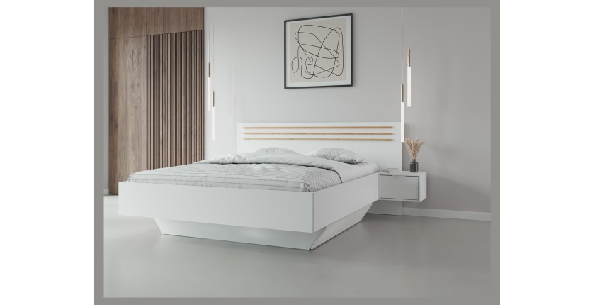 Geben Sie Ihrem Schlafzimmer einen modernen Touch mit dem Bett FLORENCE 160x200 cm. Entworfen in einem eleganten weißen Farbton mit Eichen-Effekt-Detail, zeichnet sich dieses Bett durch sein grafisches Kopfteil und seine zwei integrierten Nachttische mit schlichten Linien aus. Eine ideale Wahl für Liebhaber von zeitgenössischem Design, die Funktionalität suchen.