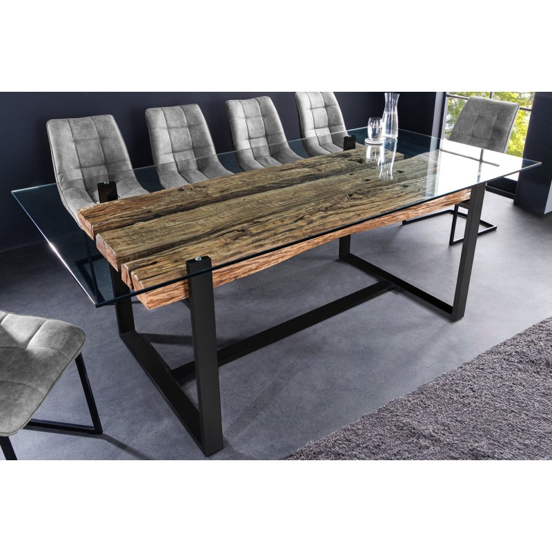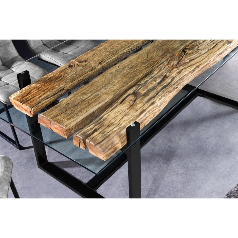 La table RAFTA combine l’authenticité du bois naturel, la robustesse du métal et la modernité du verre pour créer une pièce unique au caractère affirmé. Son design industriel en fait un véritable atout déco pour une salle à manger de style loft ou contemporain.