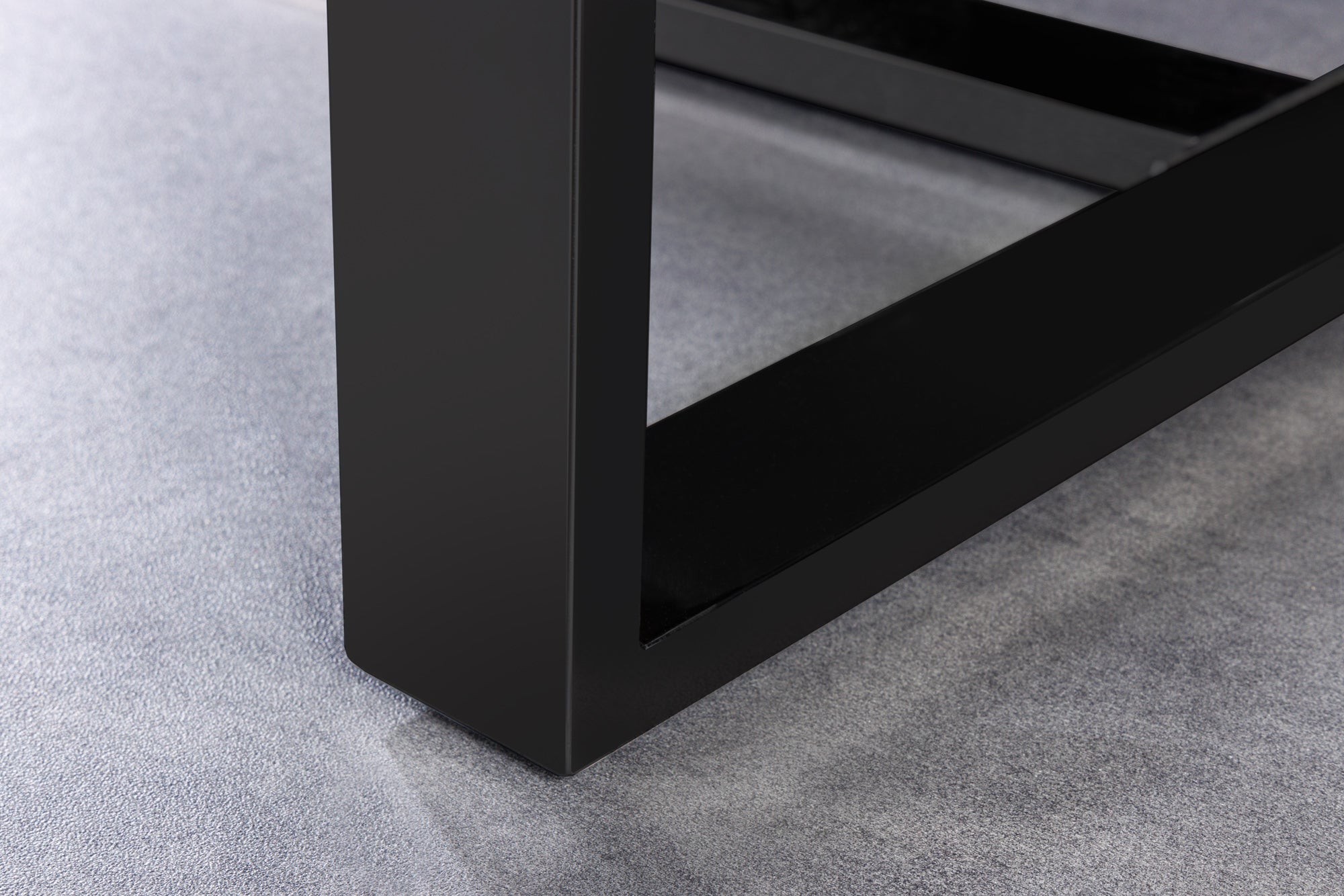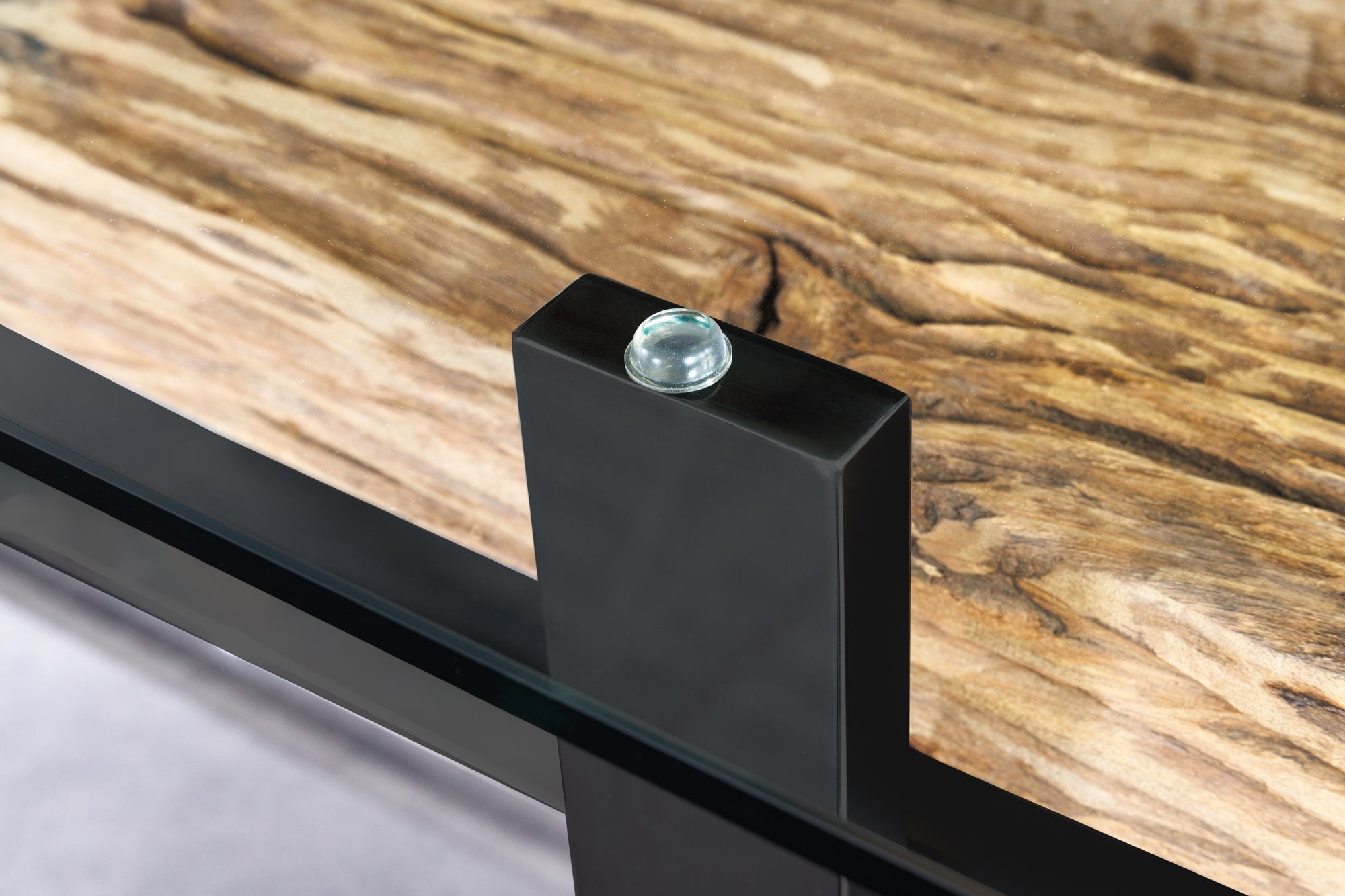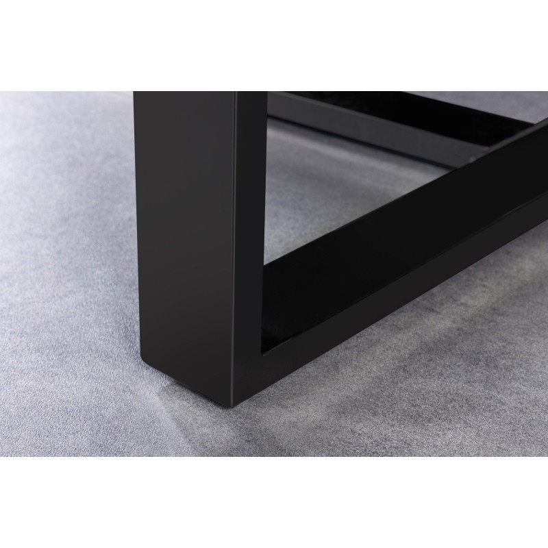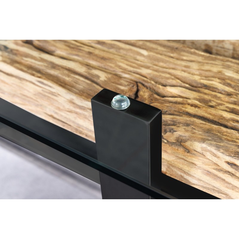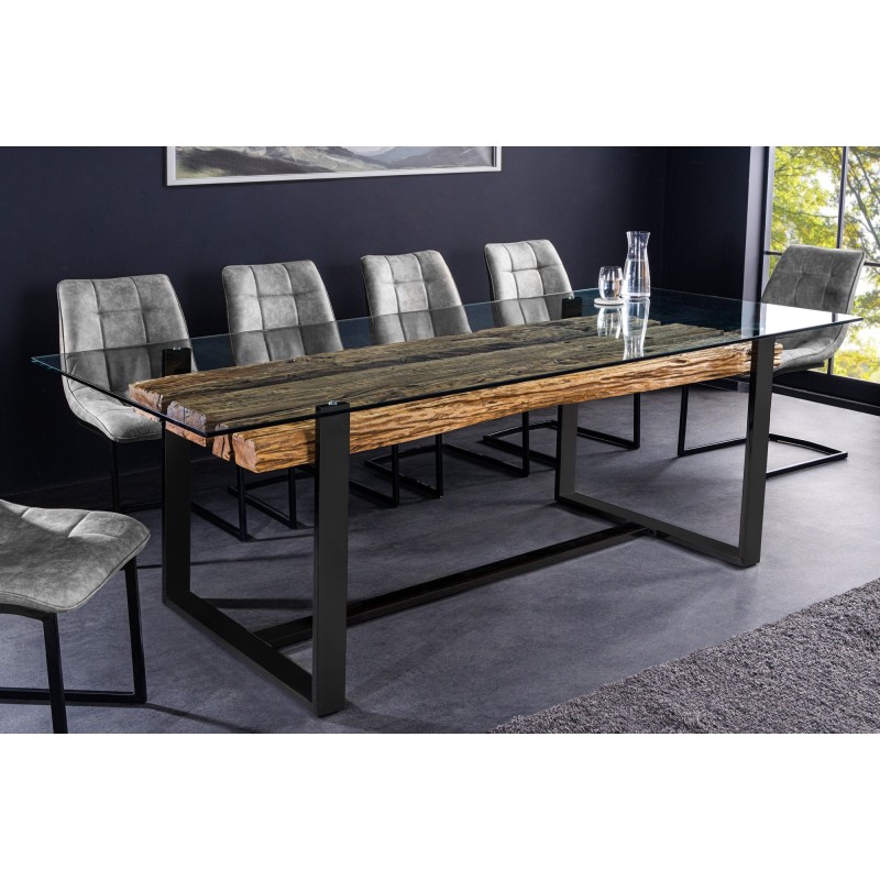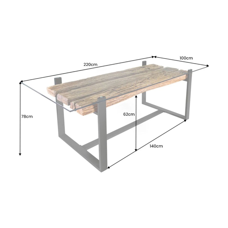 Cette table rectangulaire de 220 cm se distingue par son plateau en verre transparent reposant sur un sous-plateau en bois de teck. La structure en métal noir renforce son allure moderne et robuste, tout en offrant une stabilité optimale.