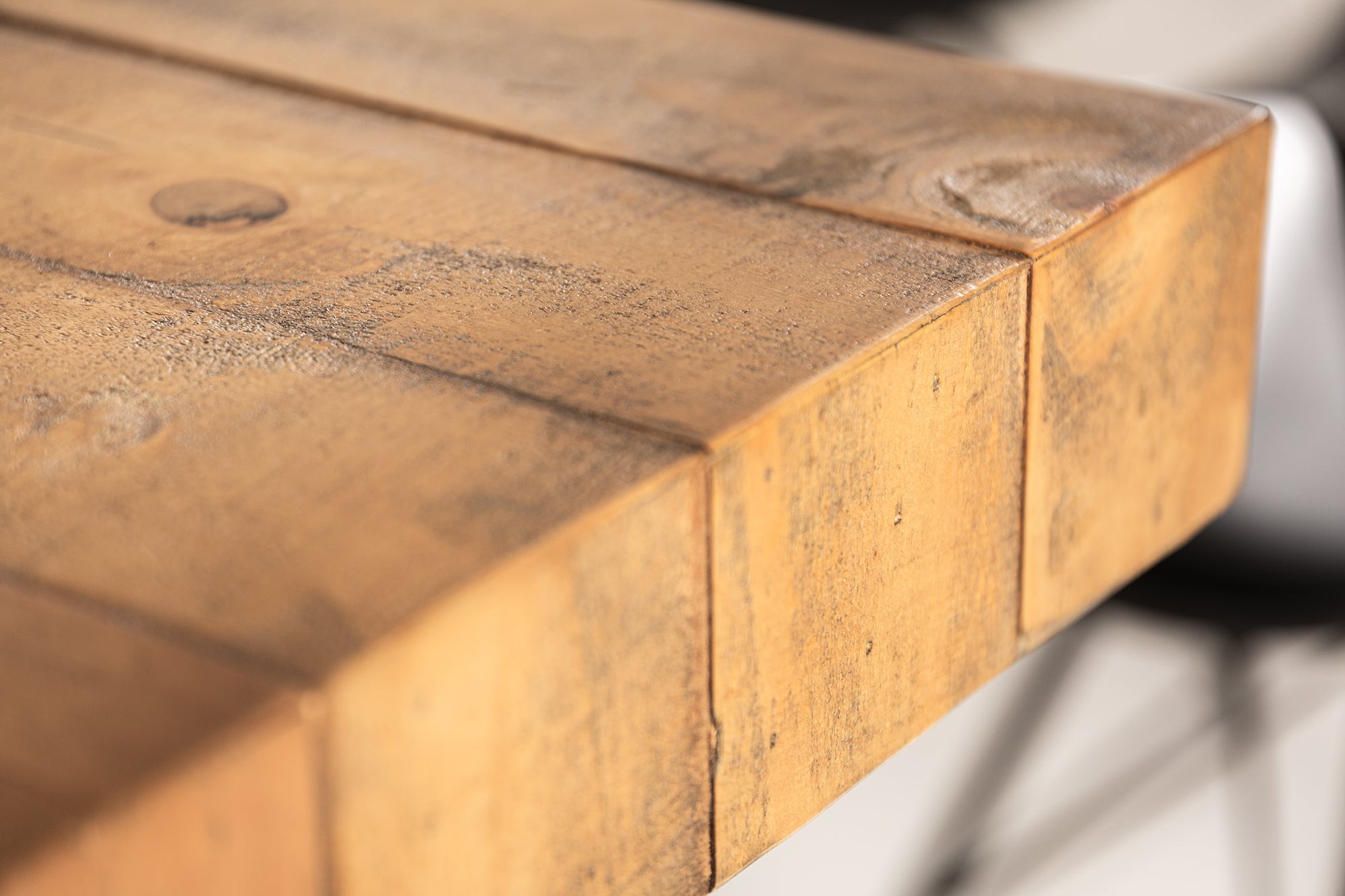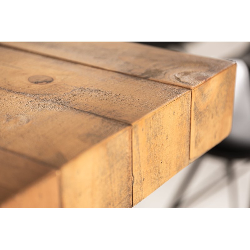 Son design rectangulaire et son association bois et métal offrent un look rustique et authentique qui s’intègre parfaitement dans une salle à manger de caractère. Sa finition vernie sublime le bois de pin et met en valeur ses nuances naturelles.