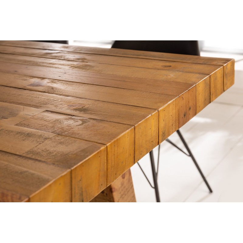 La table RANCHO allie le charme du bois naturel verni et la solidité du métal. Avec son grand plateau rectangulaire de 200 cm, elle est idéale pour accueillir vos repas conviviaux en famille ou entre amis.