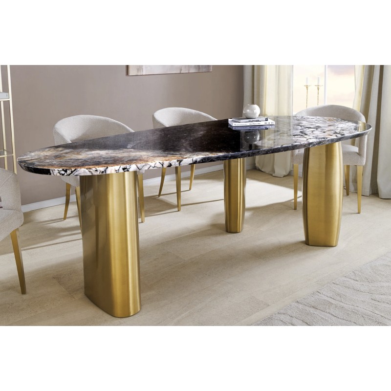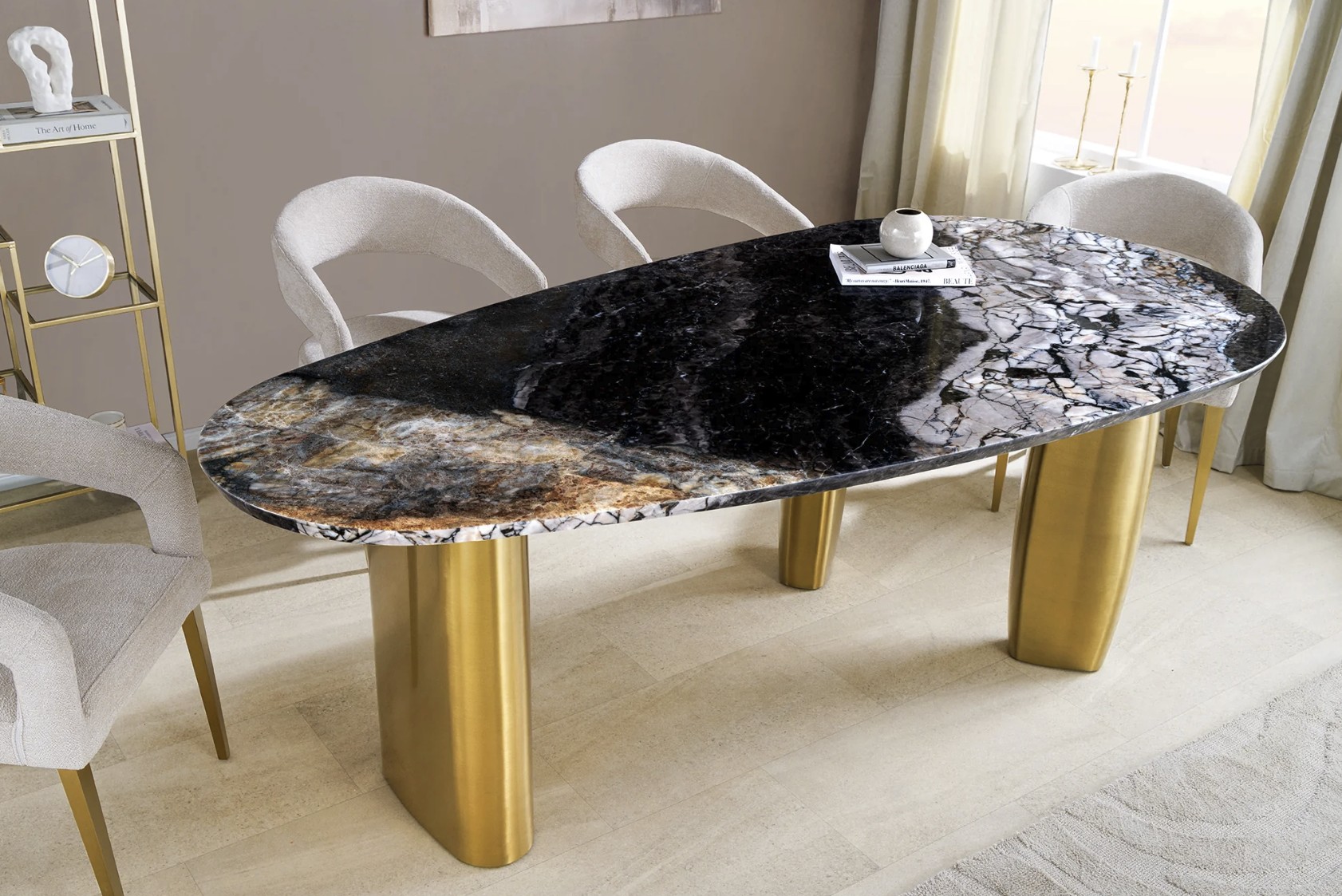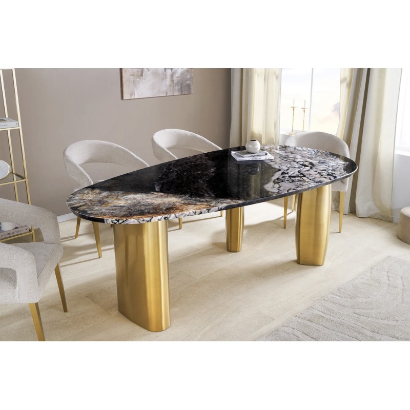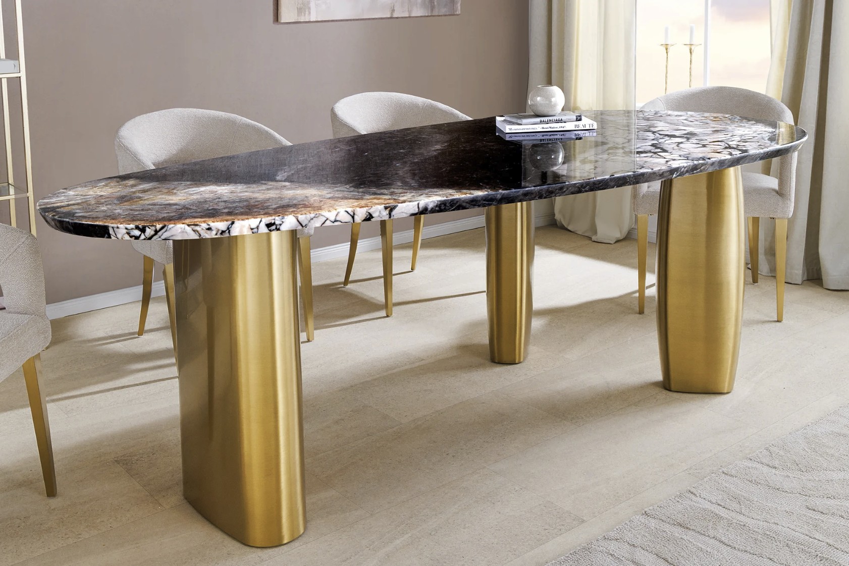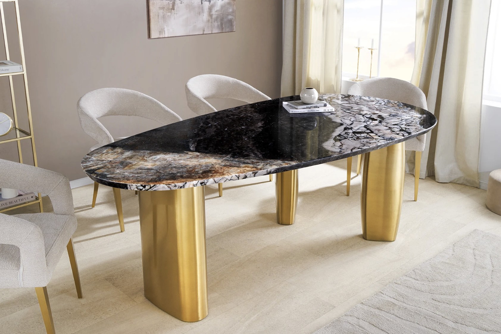 La table NERA est une pièce d’exception qui allie la noblesse du marbre gris à la robustesse d’une structure en métal coloris or. Avec son design ovale raffiné, elle incarne le chic et la modernité, idéale pour sublimer votre salle à manger.