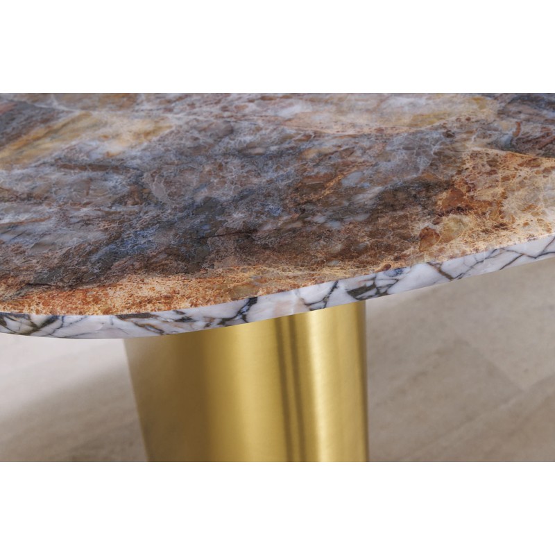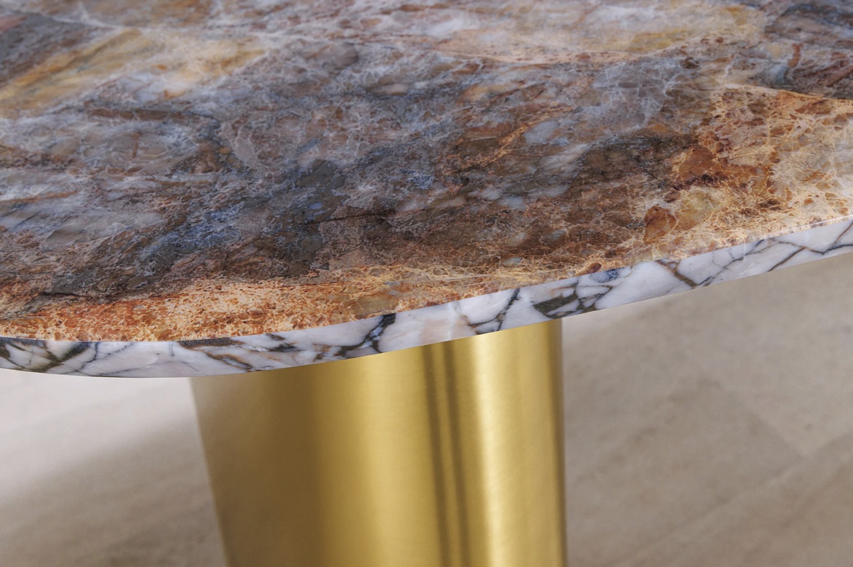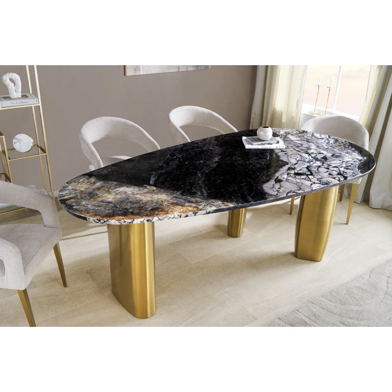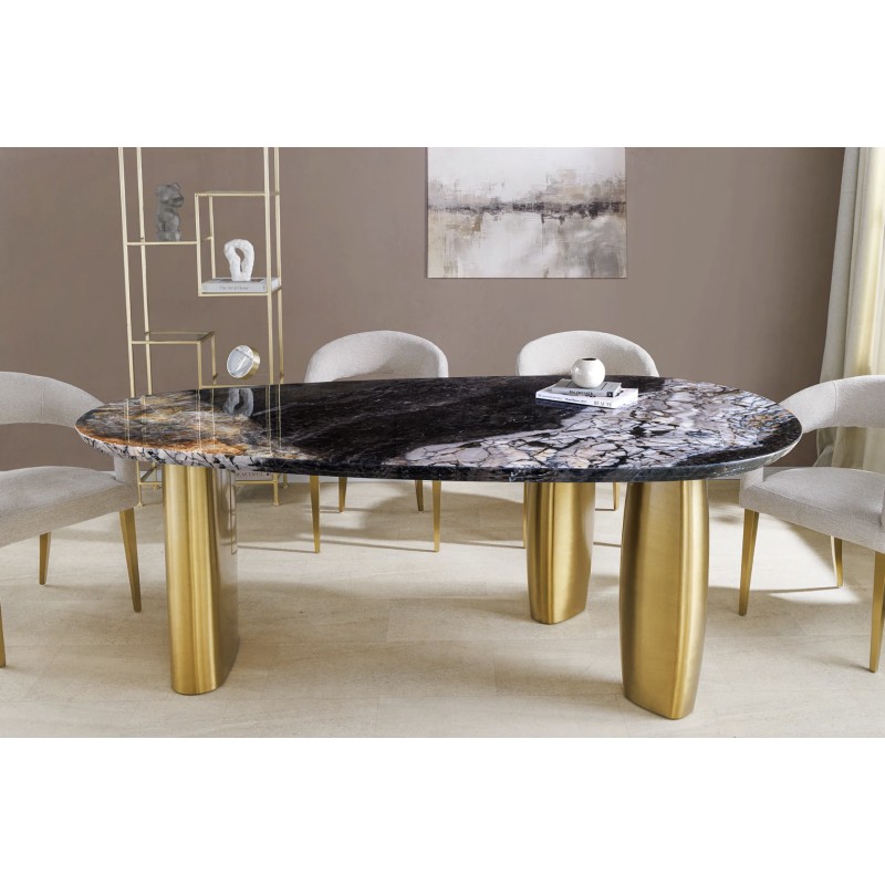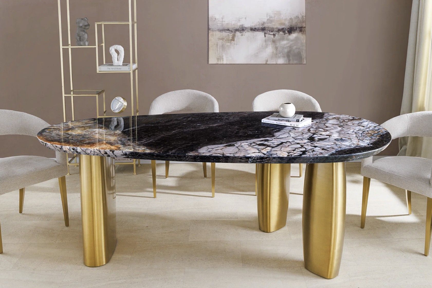 La table NERA est une pièce d’exception qui allie la noblesse du marbre gris à la robustesse d’une structure en métal coloris or. Avec son design ovale raffiné, elle incarne le chic et la modernité, idéale pour sublimer votre salle à manger.
