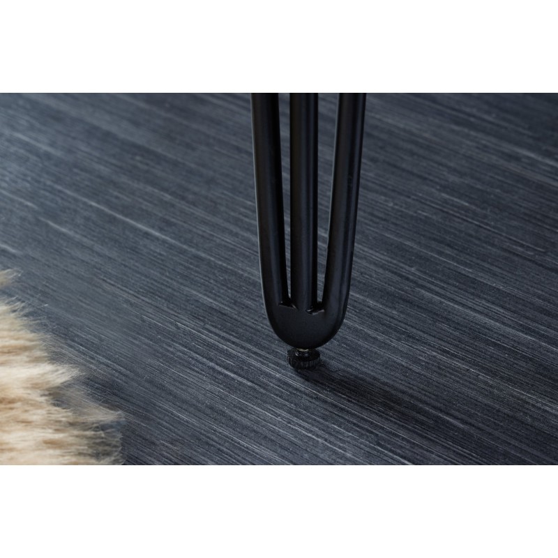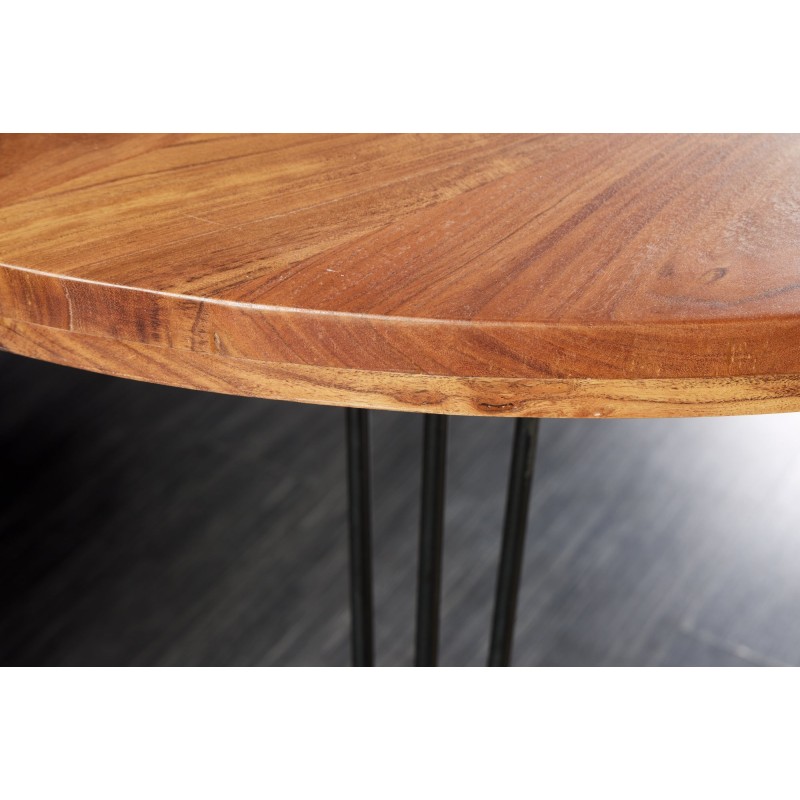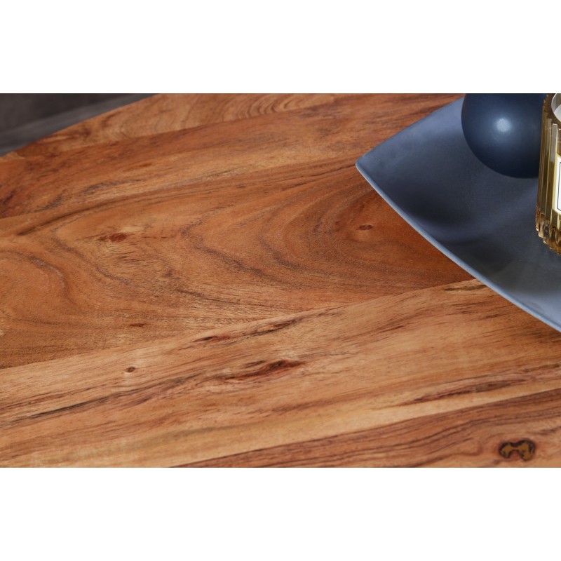 Le plateau en acacia massif séduit par son aspect brut et ses nuances naturelles uniques, sublimées par une finition vernie qui protège durablement le bois. Son épaisseur de 45 mm témoigne de sa solidité et de sa qualité. La structure en métal noir assure une excellente stabilité tout en renforçant le style industriel. Sa distance entre les pieds de 80 cm permet une assise confortable pour 4 personnes autour de la table.