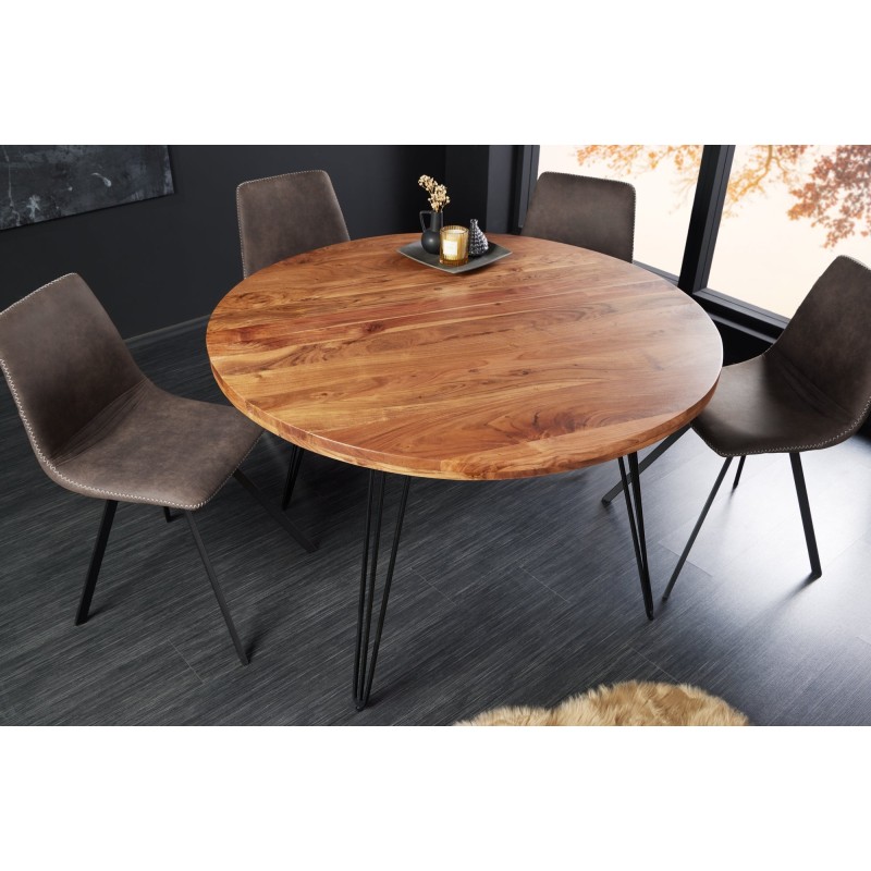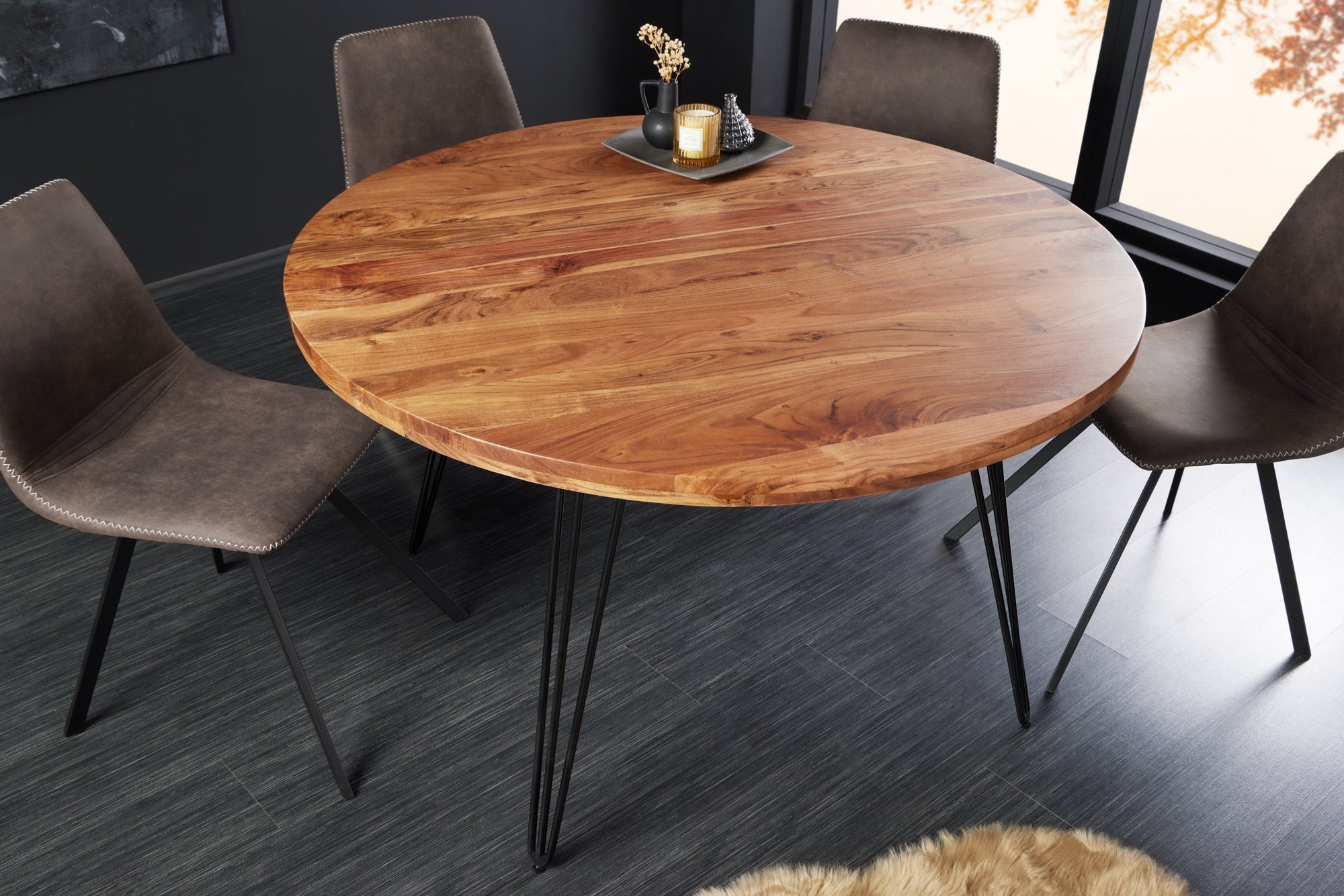 La table de salle à manger TALOA combine le charme naturel du bois massif d’acacia à la modernité du métal noir. Son plateau rond de 120 cm en fait une table conviviale et pratique, idéale pour les petits espaces souhaitant un mobilier de caractère. Alliant design industriel et finitions soignées, elle apportera une touche chaleureuse et contemporaine à votre intérieur.