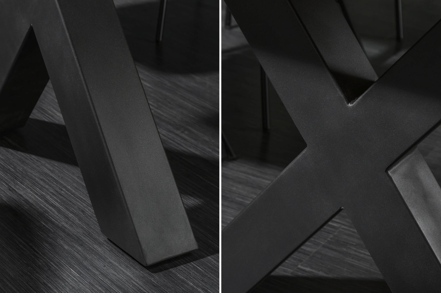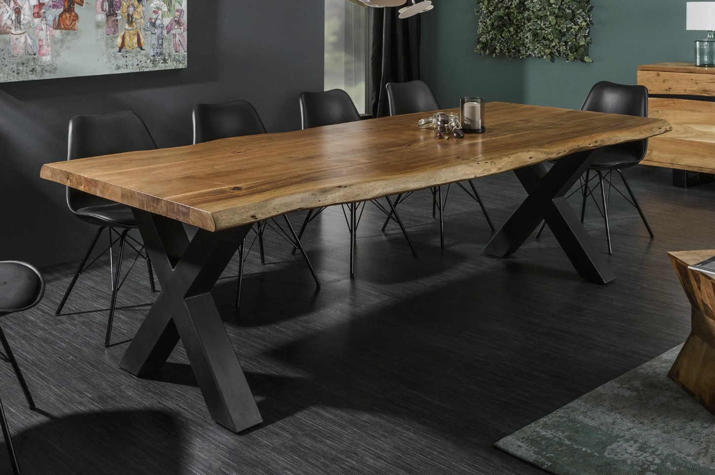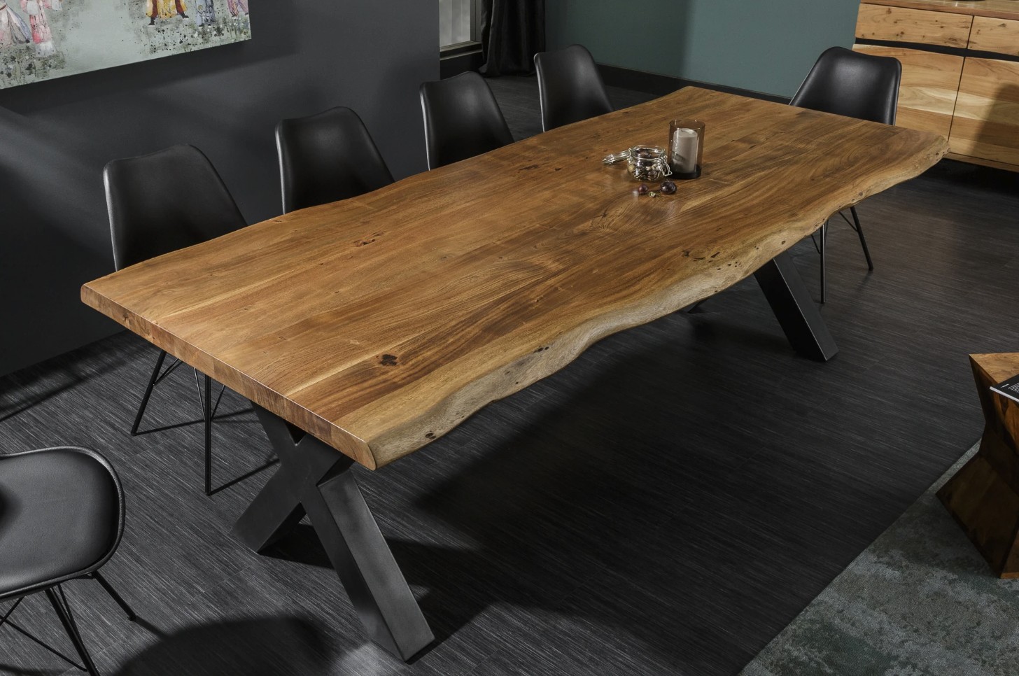 Mit Authentizität und Modernität vereint, besticht der Esstisch ARKAYA 200 cm durch seine Konstruktion aus lackiertem massivem Akazienholz und seinem Gestell aus schwarzem Metall in X-Form. Sein industrielles und warmes Design passt perfekt in ein zeitgenössisches oder rustikales Dekor. Es ist ein zentrales Möbelstück, das Ihrer Essecke Charakter verleihen wird.