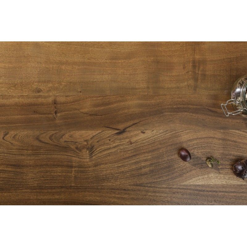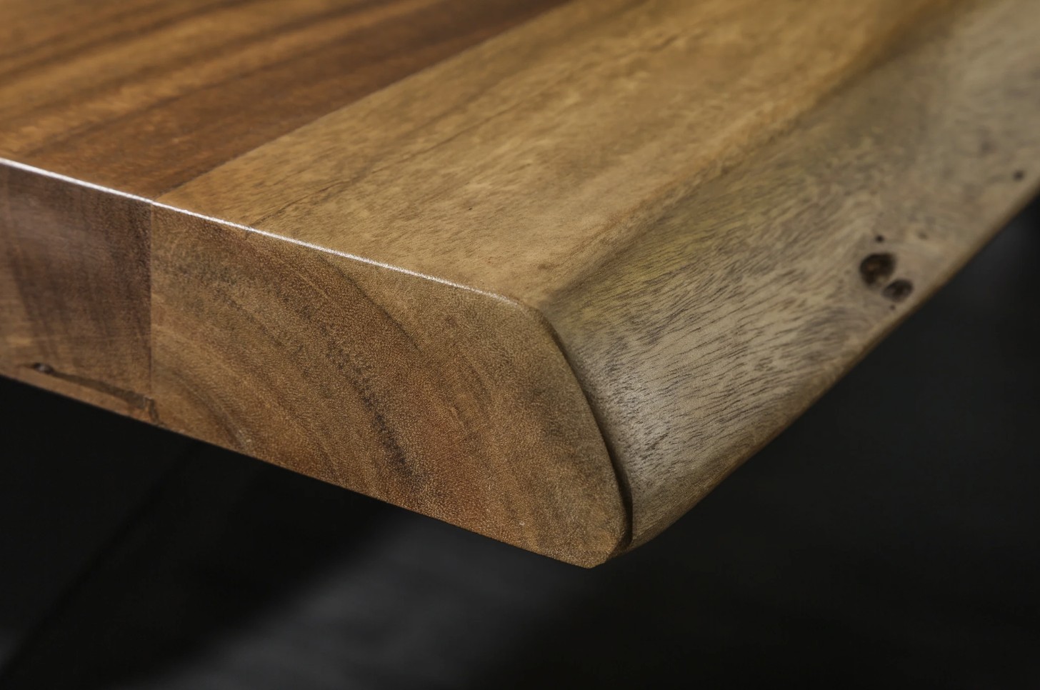 Mit seiner Plattendicke von 60 mm, stellt der Tisch ARKAYA seine Robustheit und Langlebigkeit unter Beweis. Seine lackierte Oberfläche betont die warmen Nuancen des massiven Akazienholzes, während seine schwarzen Metallbeine eine beispiellose Stabilität und einen entschiedenen industriellen Look gewährleisten. Der Abstand zwischen den Beinen von 139 cm garantiert großen Komfort für Ihre täglichen Mahlzeiten oder gesellige Momente.