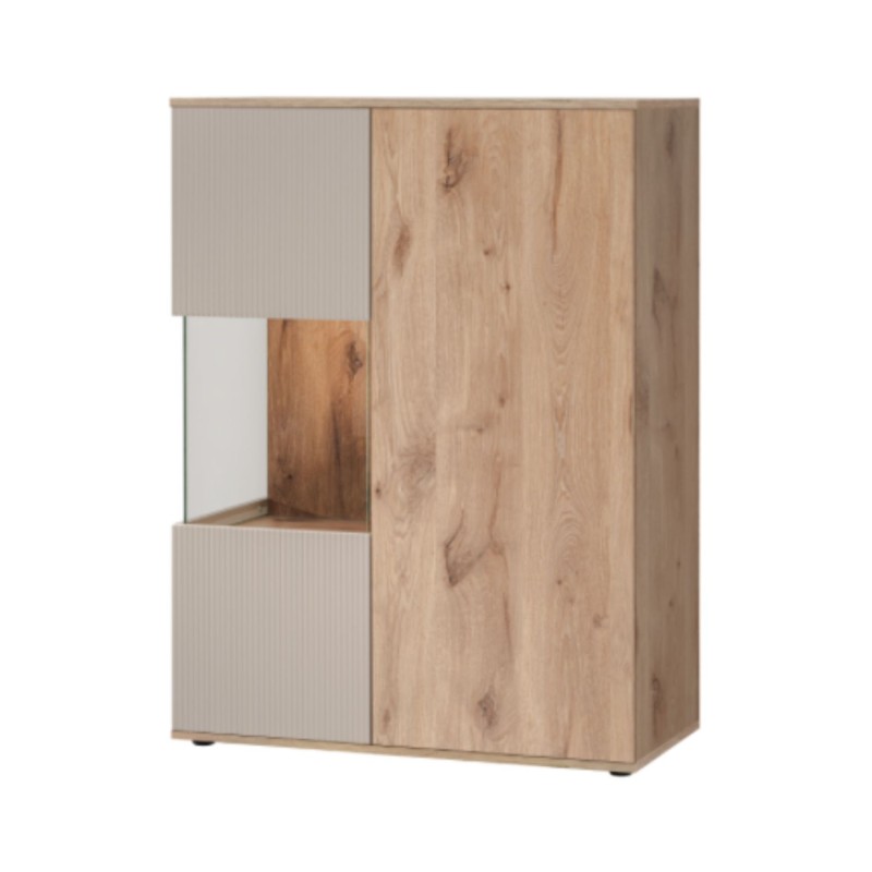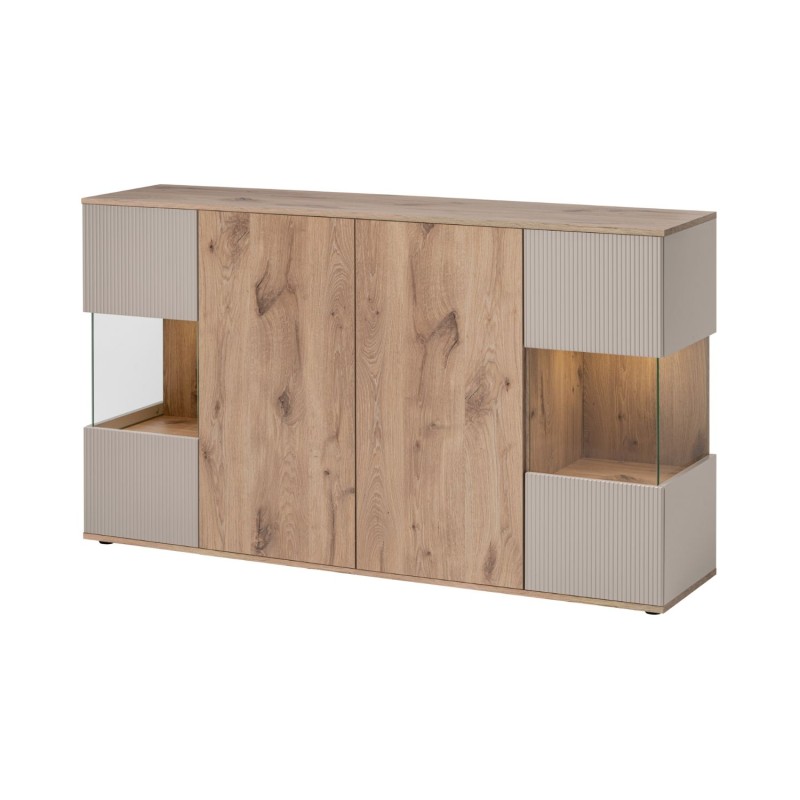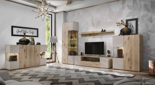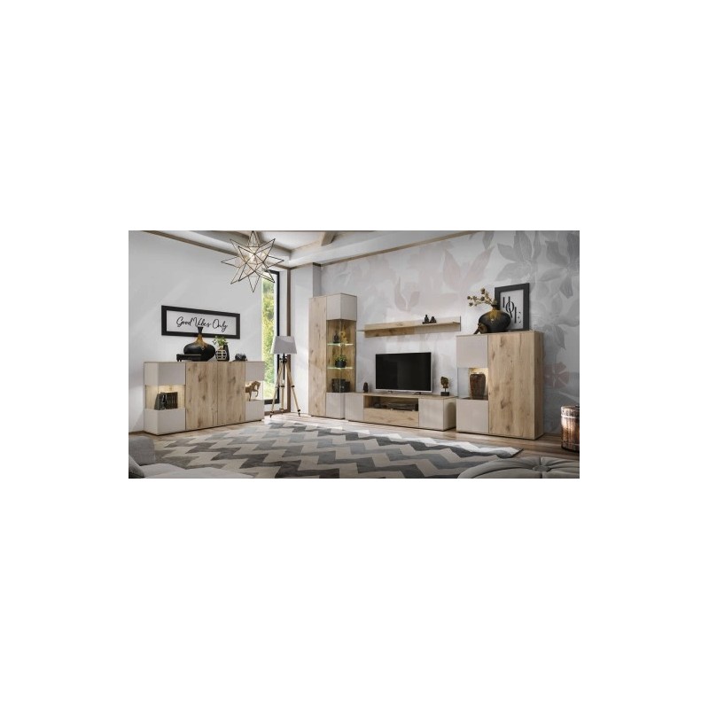 Offrez à votre séjour une atmosphère chaleureuse et fonctionnelle avec l’ensemble de salon ERINA. Ce pack tout-en-un associe un buffet bas, un buffet haut, une vitrine, un meuble TV et une étagère murale. Avec son mariage de chêne clair et de beige, il séduit par son style scandinave moderne et sa praticité au quotidien.