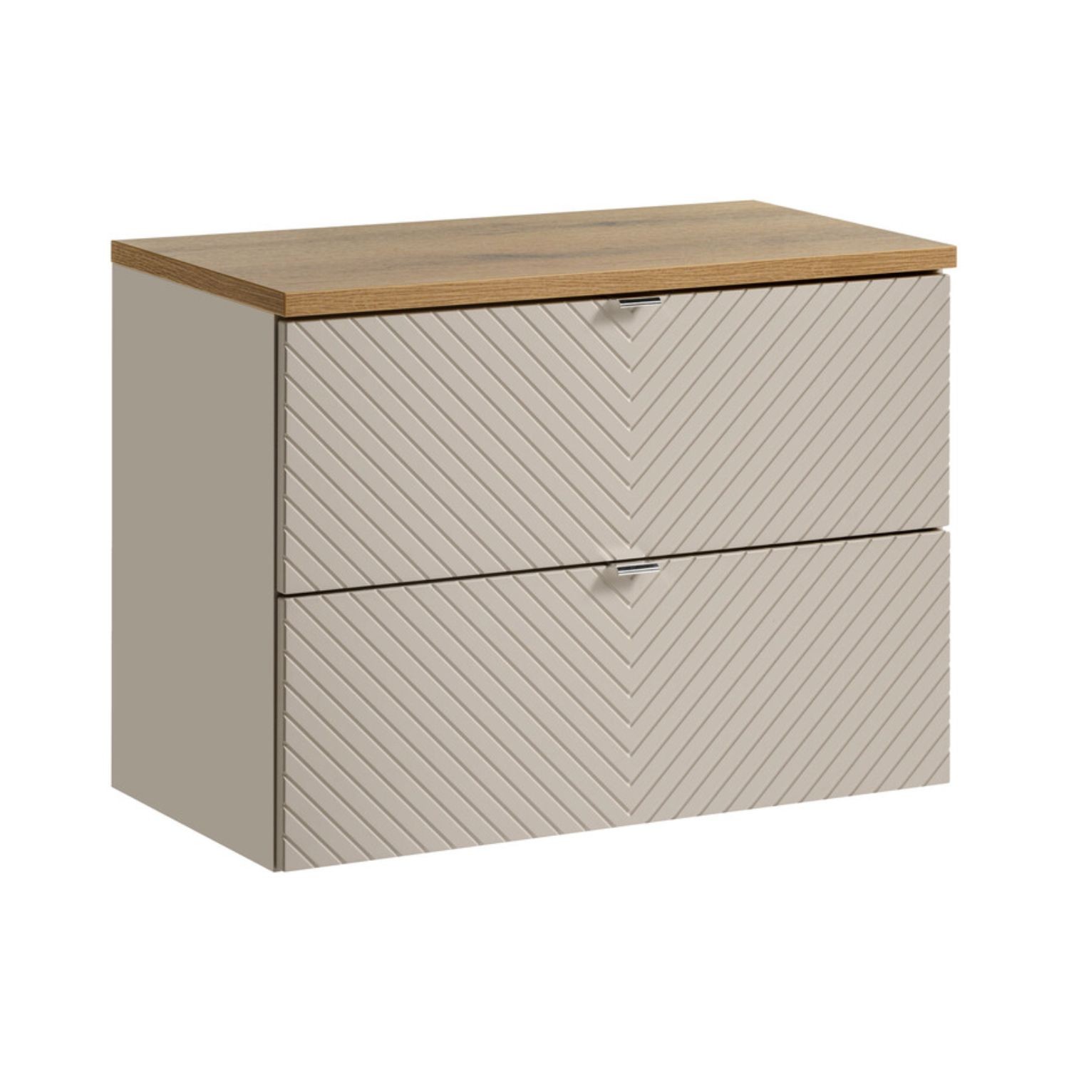 Bringen Sie Wärme und Modernität in Ihr Badezimmer mit diesem Set AOKI 80 cm, bestehend aus einem Unterschrank mit Schubladen und einem Waschtisch in Holzoptik. Seine Farbe matte Kaschmir kombiniert mit der hellen Holztextur schafft eine raffinierte und beruhigende Japandi-Atmosphäre.