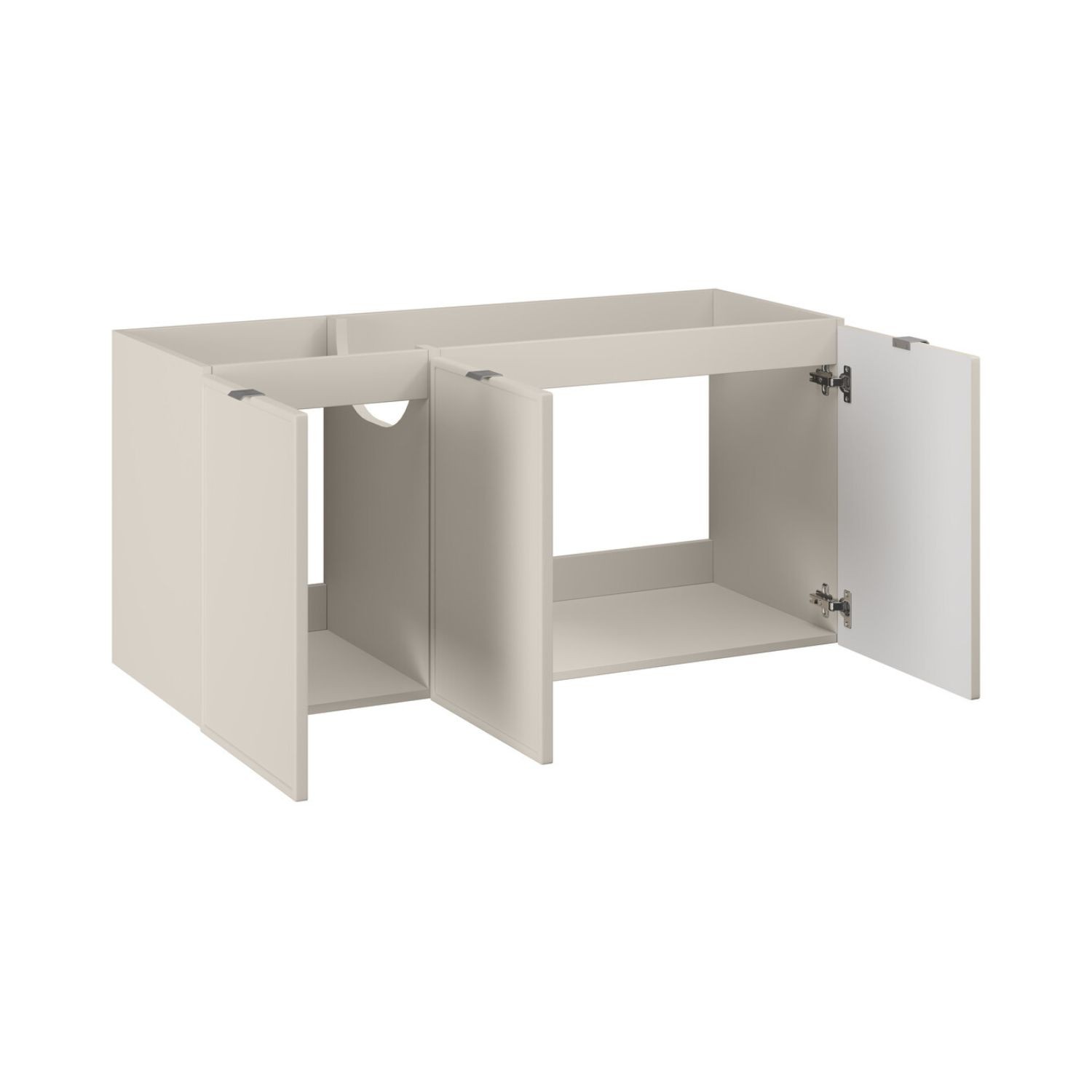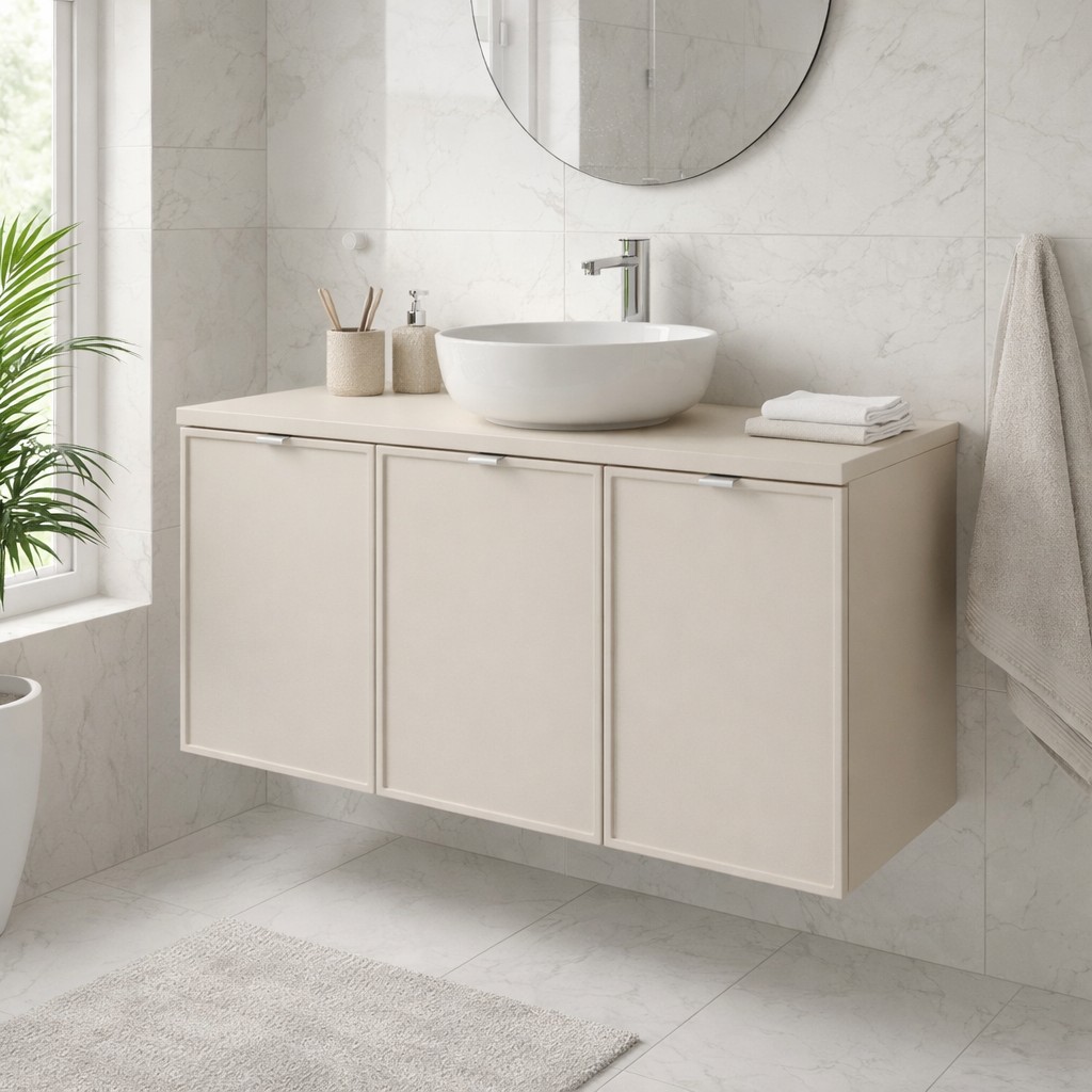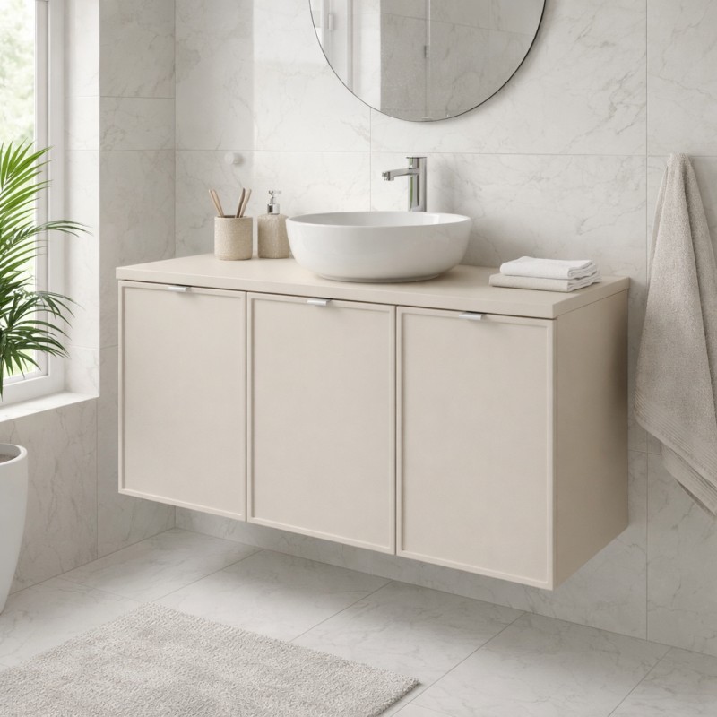 Dank seiner Größe von 120 cm bietet dieses Set eine schöne Balance zwischen Stauraum und kontrolliertem Platzbedarf, ideal für moderne Badezimmer. Der Unterschrank ermöglicht eine effiziente Organisation der täglichen Essentials, während die Platte für das Waschbecken eine gepflegte und funktionale Oberfläche bietet. Seine Ausführung in matt Kaschmir verleiht eine sanfte und originelle Note, perfekt, um eine zeitgenössische, helle Atmosphäre zu schaffen, die einfach mit verschiedenen Waschbeckenstilen kombiniert werden kann.