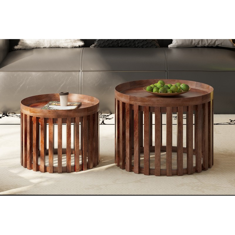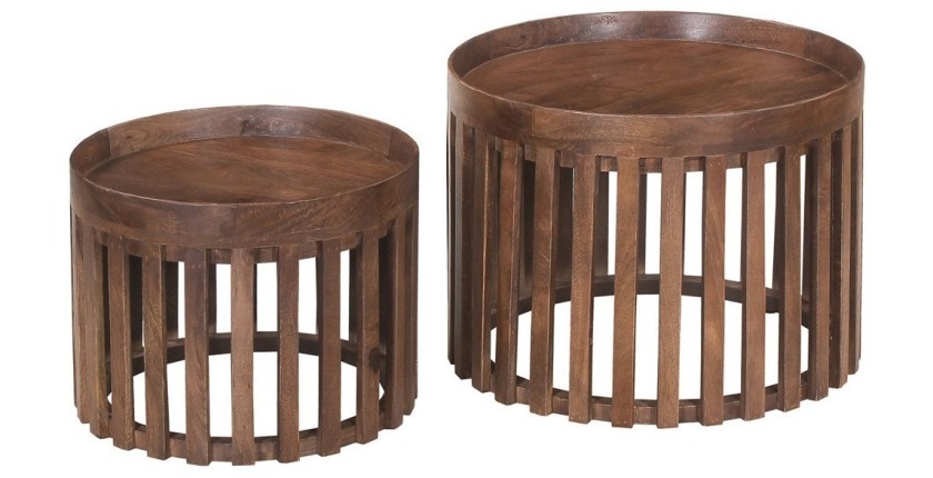 Set von zwei runden Couchtischen CANYON – Massives Mangoholz – Ethnischer Stil und DesignDas Set von zwei runden Couchtischen CANYON ist ein elegantes und funktionales Möbelstück, das Ihrem Wohnzimmer eine ethnische und moderne Note verleiht. Diese runden Tische aus massivem Mangoholz in hellem Braun passen perfekt zu jeder Art von Inneneinrichtung. Das ineinandergreifende Design und die unterschiedlichen Größen dieser Tische machen sie ideal, um Platz zu maximieren, während sie eine raffinierte Ästhetik bieten.Produktmerkmale:Produkttyp: Set von zwei runden CouchtischenKollektion: CANYONMaterial: Massives MangoholzFarbe: Helles BraunStil: Ethnisch / DesignMaße Tisch 1: Durchmesser: 60 cm x Höhe: 45 cmMaße Tisch 2: Durchmesser: 48 cm x Höhe: 37 cmAnzahl der Pakete: 1Struktur: Nicht ausziehbares MassivholzVorteile des CANYON Couchtisch-Sets:Ineinandergreifendes Design: Die beiden Tische können zusammen oder getrennt verwendet werden, je nach Ihren Bedürfnissen und zur Optimierung des Raums.Ethnischer und moderner Stil: Perfekt für ein Interieur mit einzigartigem und warmem Charakter.Langlebigkeit: Hergestellt aus massivem Holz, sind diese Tische robust und widerstandsfähig gegen Verschleiß.Warum sollten Sie das CANYON Couchtisch-Set wählen?Natürliche Ästhetik: Das helle Mangoholz verleiht Ihrer Dekoration eine warme und raffinierte Note.Vielseitigkeit: Ideal für kleine Räume oder als praktische und ästhetische Ergänzung in einem geräumigen Wohnzimmer.Einfache Pflege: Mangoholz ist langlebig und einfach zu reinigen, perfekt für den täglichen Gebrauch.