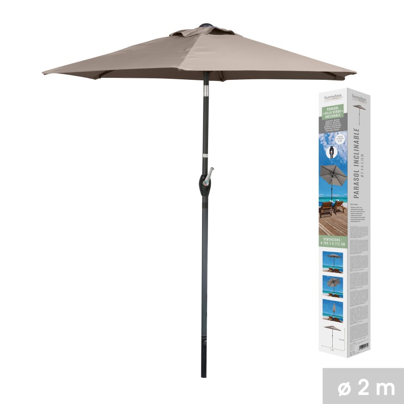Genießen Sie angenehmen Schatten mit diesem neigbaren Sonnenschirm in Taupe, ideal um einen komfortablen Außenbereich auf Ihrer Terrasse, Ihrem Balkon oder im Garten zu gestalten. Sein Durchmesser von 2 Metern sorgt für guten Sonnenschutz, während seine Höhe von 2,13 Metern einen ausgezeichneten Nutzungskomfort bietet. Er ist leicht zu handhaben und verfügt über eine verchromte Kunststoffkurbel für einfaches Öffnen und Schließen.