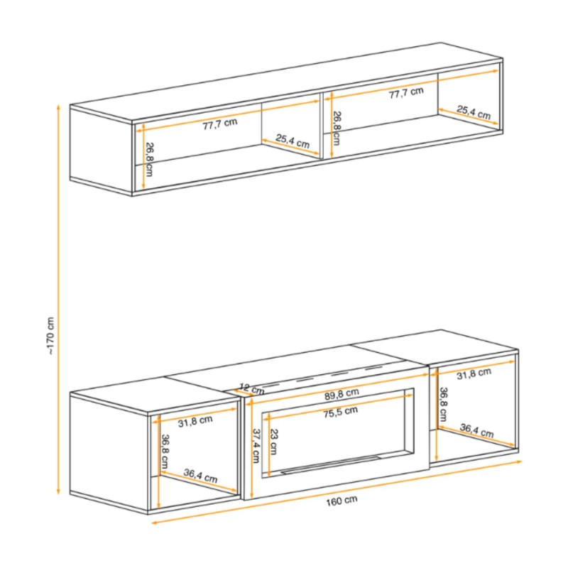 Le meuble TV est équipé d’une cheminée bio-éthanol centrale, idéale pour instaurer une ambiance chaleureuse et conviviale. De part et d’autre, deux compartiments fermés offrent un espace de rangement discret pour vos accessoires multimédia.