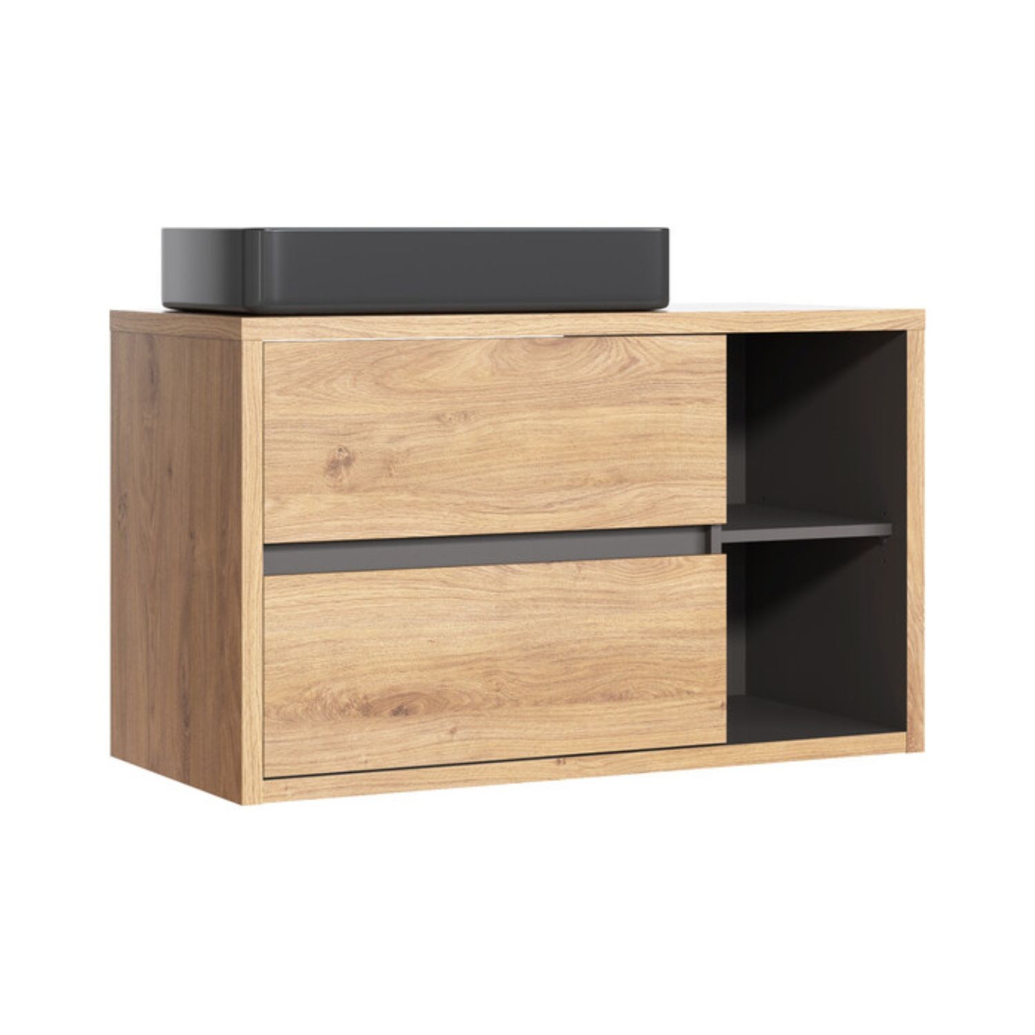Die Kombination aus hellem Eichenholz und anthrazitgrau verleiht Ihrem Interieur Charakter. Der Unterschrank bietet funktionellen Stauraum durch seine Schiebeschubladen, ideal um Ihre täglichen Pflegeprodukte zu organisieren. Das aufsitzende schwarze Waschbecken wird zu einem wahren Dekorationselement und verstärkt die moderne Identität des Sets. Kompakt, aber strukturiert, ist dieses Set perfekt für heutige Badezimmer geeignet, die Stil und Funktionalität suchen.