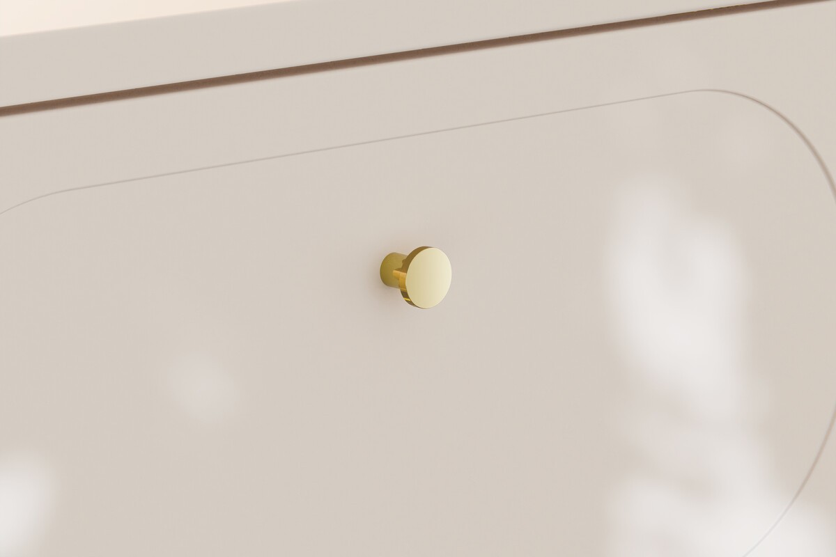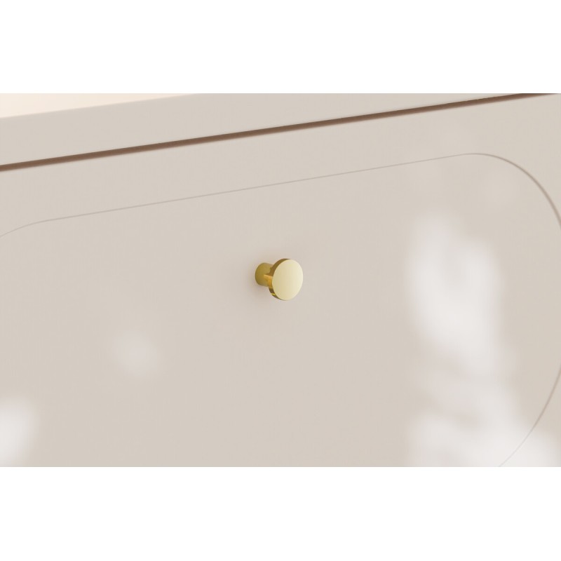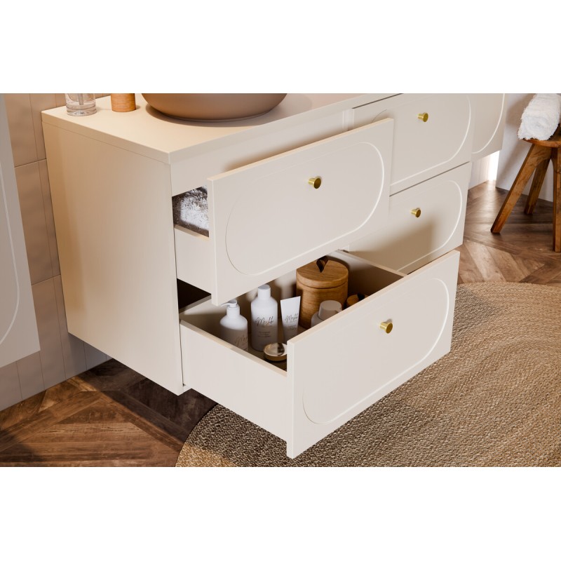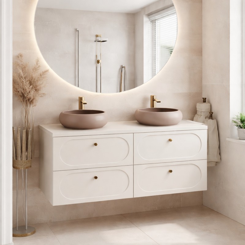 Die Unterschränke beeindrucken mit ihren Griffen mit goldenen Verzierungen und ihren Fronten, die mit einem leicht vertieften ovalen Rahmen verziert sind, was Tiefe und einen raffinierten Touch verleiht. Die Schubladen auf Schienen bieten eine praktische und flüssige Lagerung im Alltag. Die beige Sandplatte harmoniert mit dem gesamten Ensemble, während die runden Cappuccino-Keramikwaschbecken zu echten Dekorationselementen werden und den warmen und modernen Charakter der Komposition verstärken.