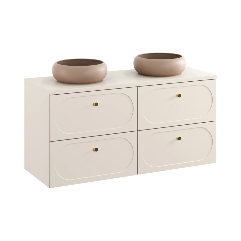 Bringen Sie Wärme und Eleganz in Ihr Zuhause mit diesem TORNADO Badezimmer-Set 120 cm in beige Sandfarbe. Es besteht aus zwei Unterschränken, einer passenden Platte für das Waschbecken und zwei runden Aufsatzwaschbecken in braunem Cappuccino, die eine elegante und moderne Atmosphäre schaffen.