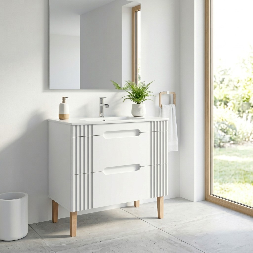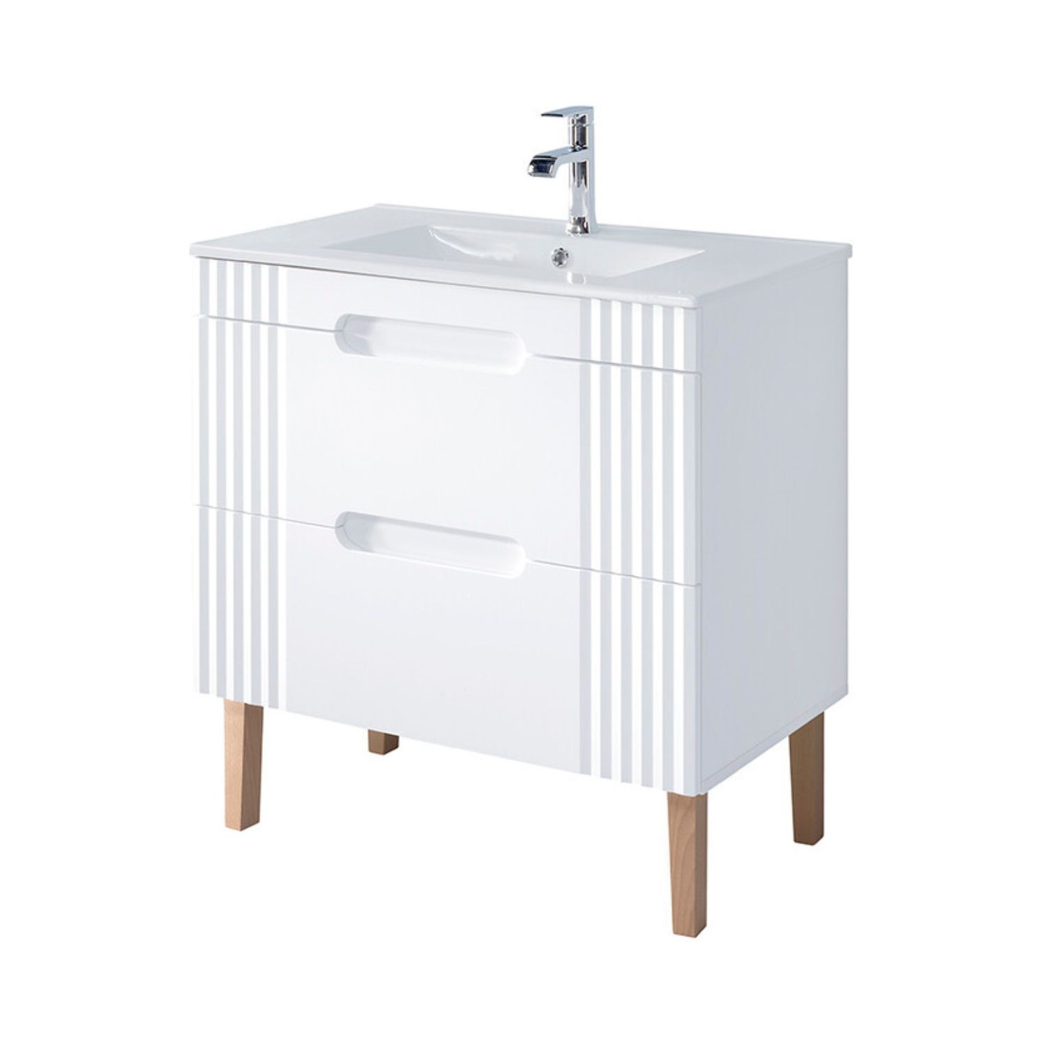 Das FIDJI Set 80 cm ist die ideale Lösung, um ein Badezimmer modern, elegant und einfach einzurichten. Sein glänzend weißer Unterbauwaschtisch bringt Helligkeit und Zeitlosigkeit in Ihren Raum.