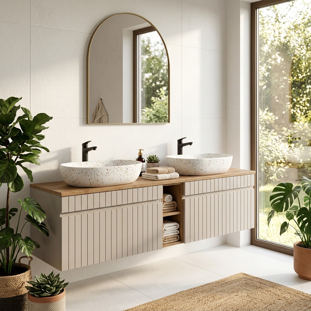 Die vertikal gerillten Fronten der Unterschränke verleihen Relief und Eleganz. Die Arbeitsplatte in Holzoptik beherbergt zwei ovale Aufsatzwaschbecken aus weißer Keramik, gesprenkelt mit bunten Punkten, die einen einzigartigen und trendigen dekorativen Akzent setzen.