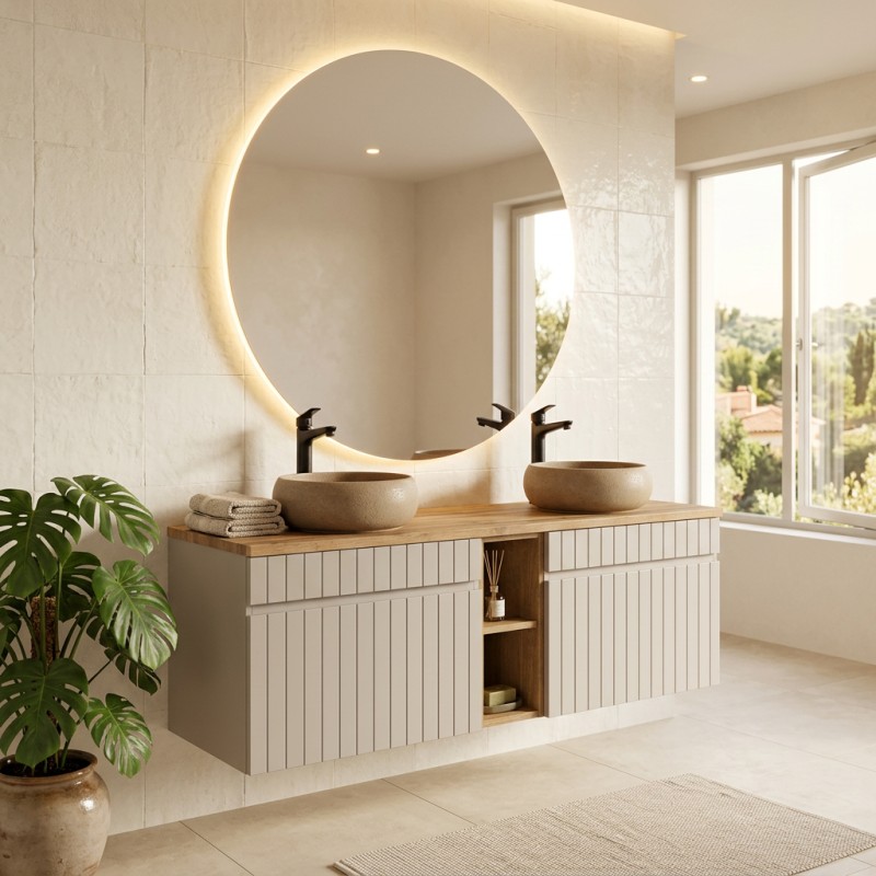 Die vertikal gerillten Fronten der Unterschränke verleihen Struktur und verstärken den modernen Charakter der Zusammenstellung. Die Arbeitsplatte für das Waschbecken beherbergt zwei runde, braune Cappuccino-aufgesetzte Waschbecken aus Keramik, die einen raffinierten und trendigen Kontrast schaffen.