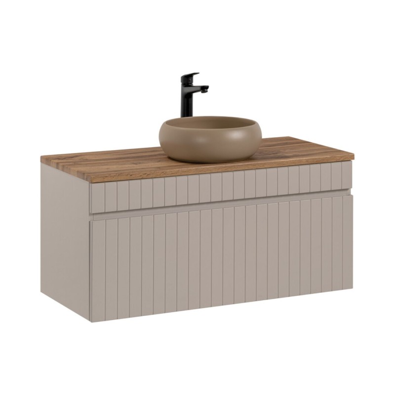 ICON Set: Waschtischunterschrank 100cm Kaschmir + Arbeitsplatte in Holzoptik + Aufsatzwaschbecken rund