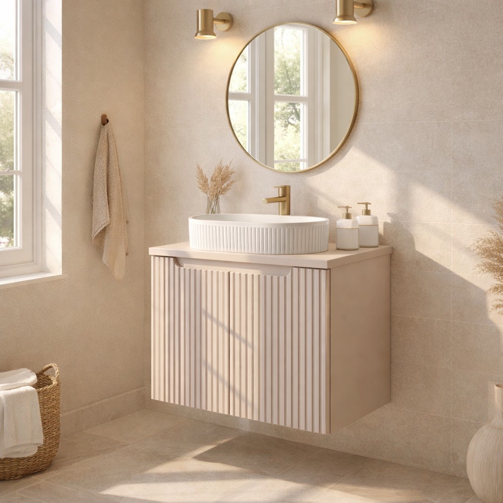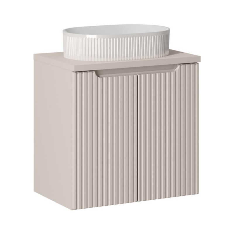 Le meuble sous vasque suspendu en finition cachemire mat se distingue par ses façades rainurées verticalement, apportant du relief et une touche contemporaine à votre salle de bain. Son format compact est idéal pour les petites surfaces tout en conservant une excellente capacité de rangement.