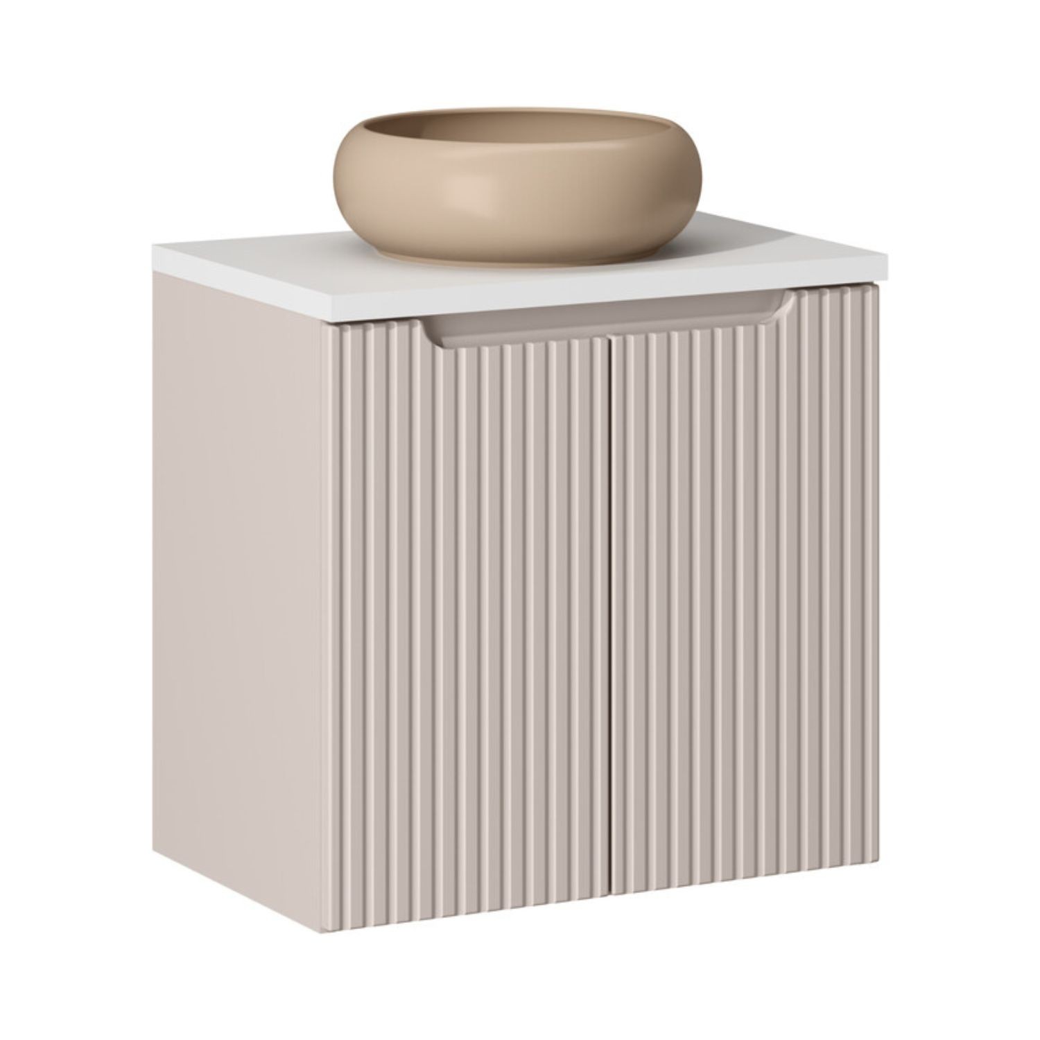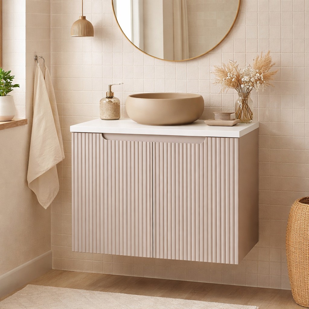 Le meuble sous vasque suspendu en coloris cachemire mat se distingue par ses façades rainurées verticalement, apportant du relief et du caractère à votre décoration. Il est associé à un plan pour vasque blanc mat, offrant un contraste lumineux et épuré.
