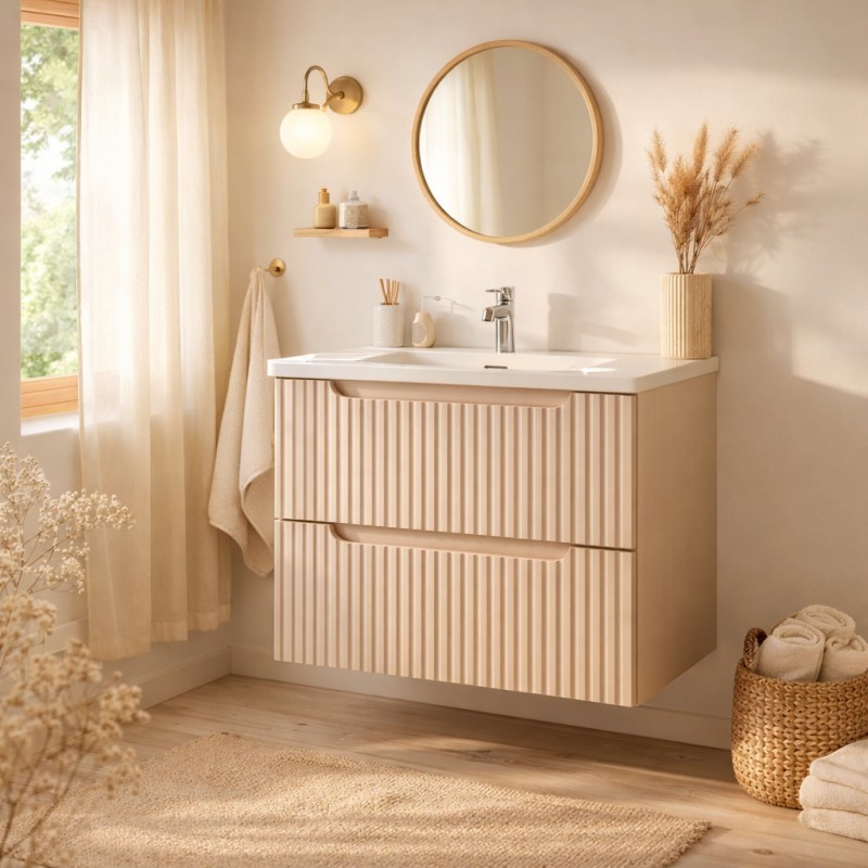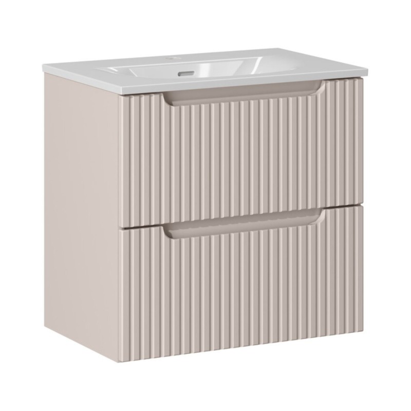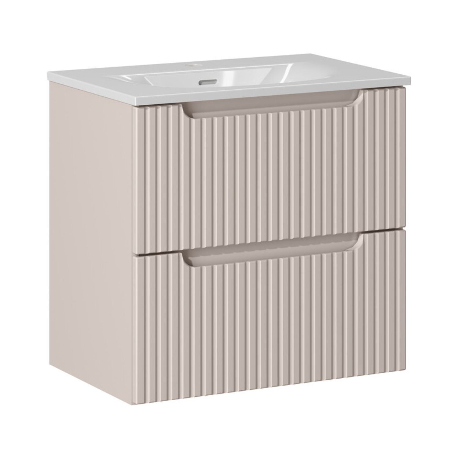 Dieses hängende Waschbeckenunterschrank in Kaschmirfarbe mit vertikal gerillten Fronten verleiht Ihrem Interieur Charakter. Es ist mit einem weißen Einbauwaschbecken kombiniert, das eine klare und täglich leicht zu pflegende Oberfläche bietet.
