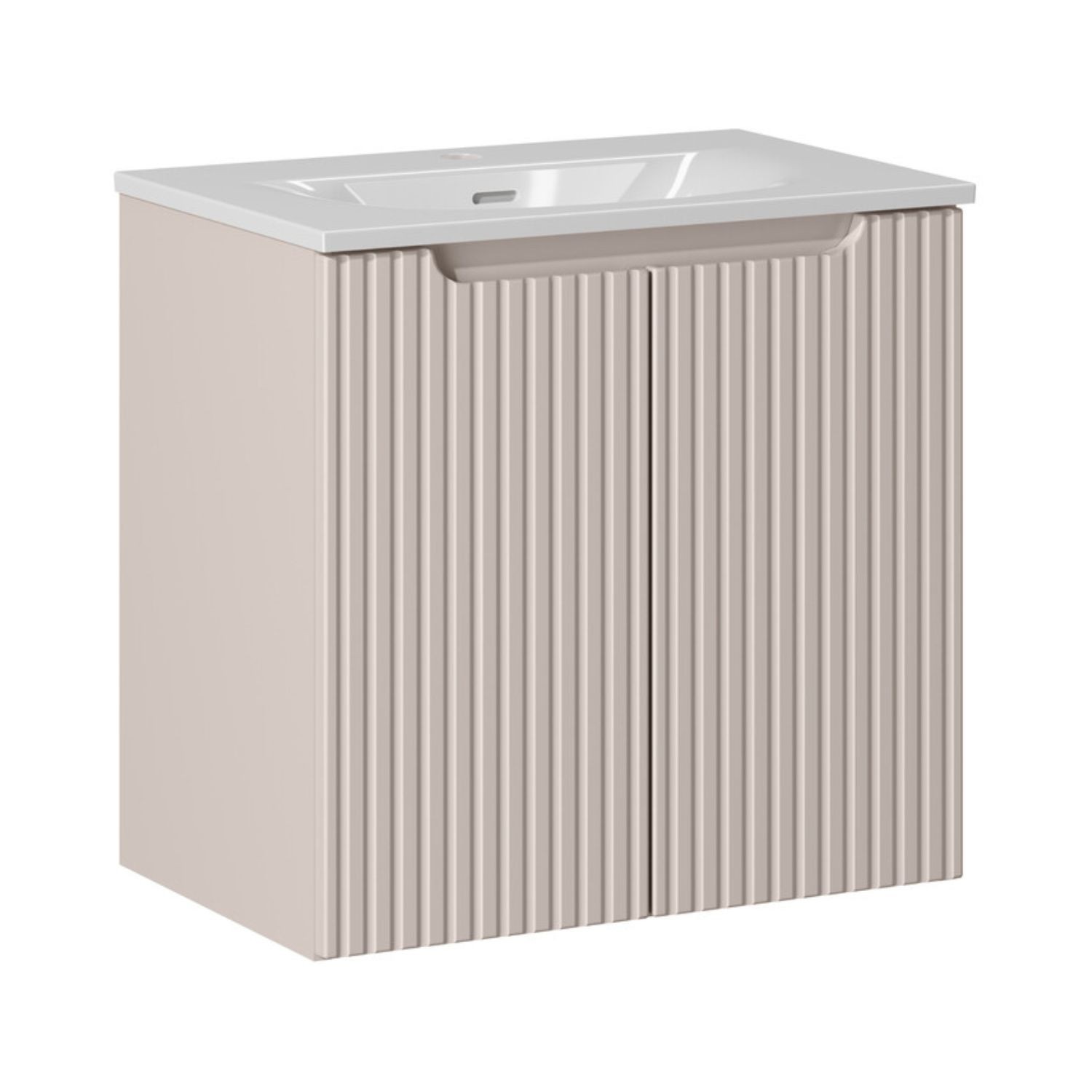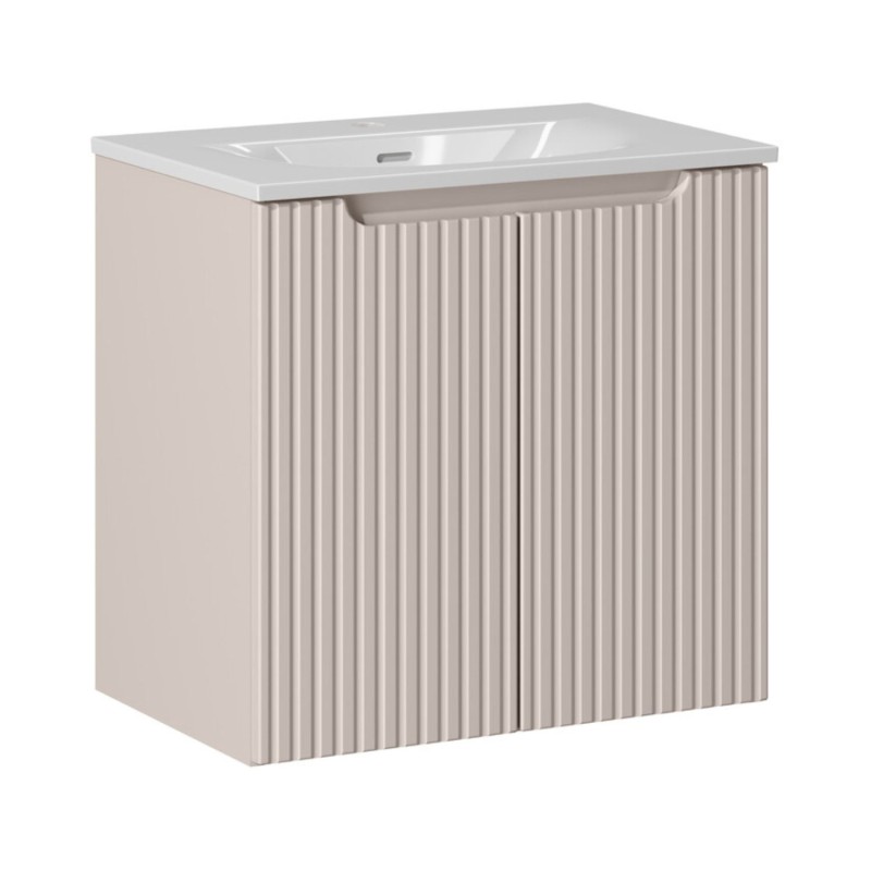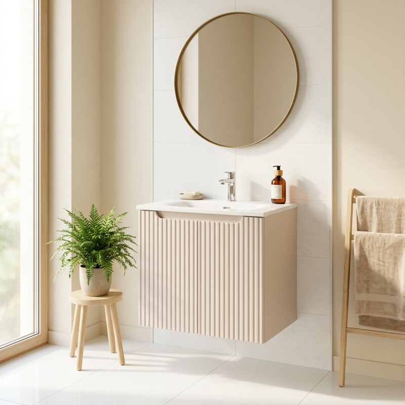 Der schwebende Unterschrank in mattem Kaschmirfarbton wird durch vertikal gerillte Fronten veredelt, die Ihrem Interieur Tiefe und einen zeitgenössischen Touch verleihen. Sein klares Design fügt sich perfekt in ein modernes und helles Badezimmer ein.