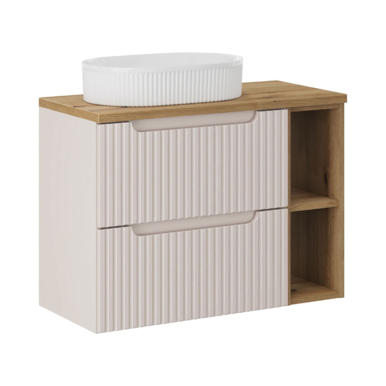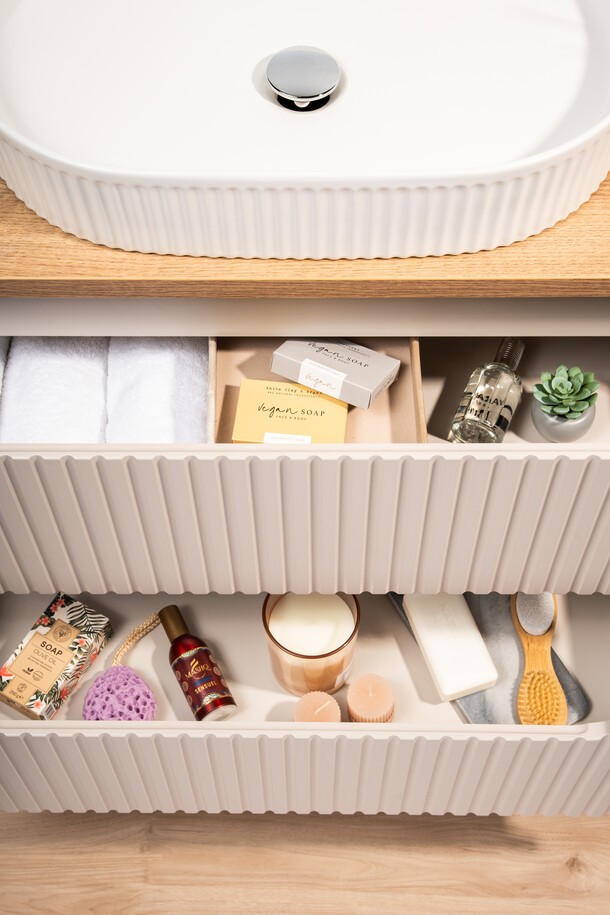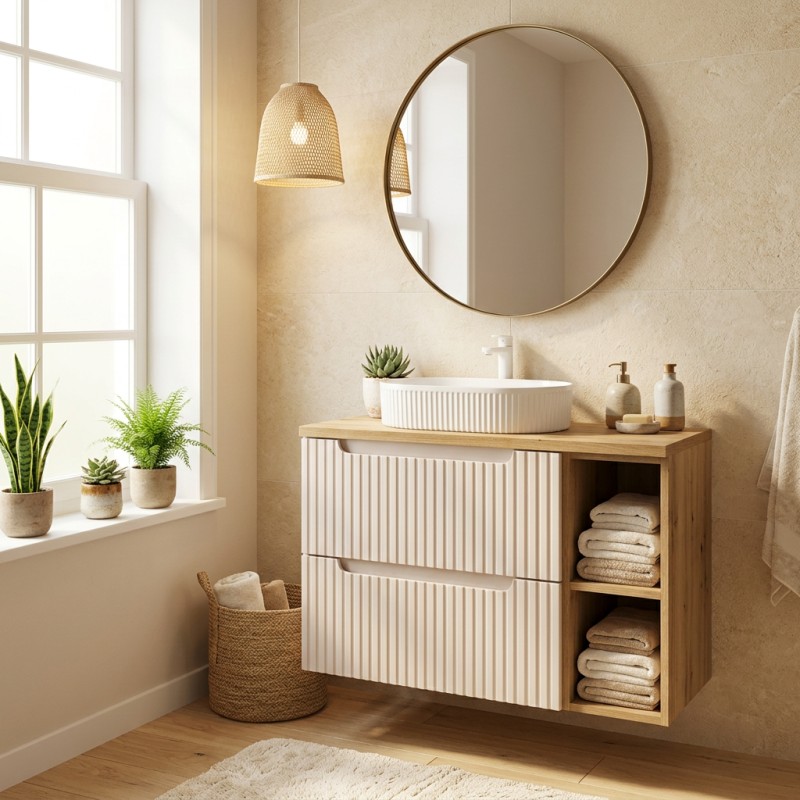 Ce meuble sous vasque suspendu en coloris cachemire avec façades rainurées verticalement apporte une touche élégante et contemporaine. L’association avec le plan pour vasque et le meuble avec niches visibles en chêne clair crée un contraste chaleureux et tendance.