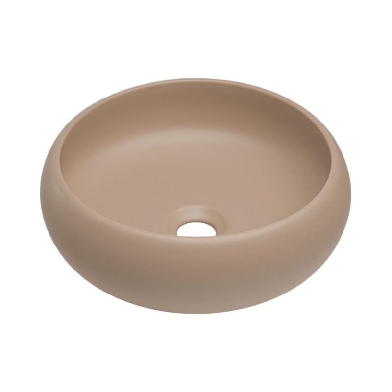 L’ensemble est complété par une vasque à poser en céramique au coloris marron cappuccino, de forme ronde, qui apporte une touche chaleureuse et originale à votre salle de bain.