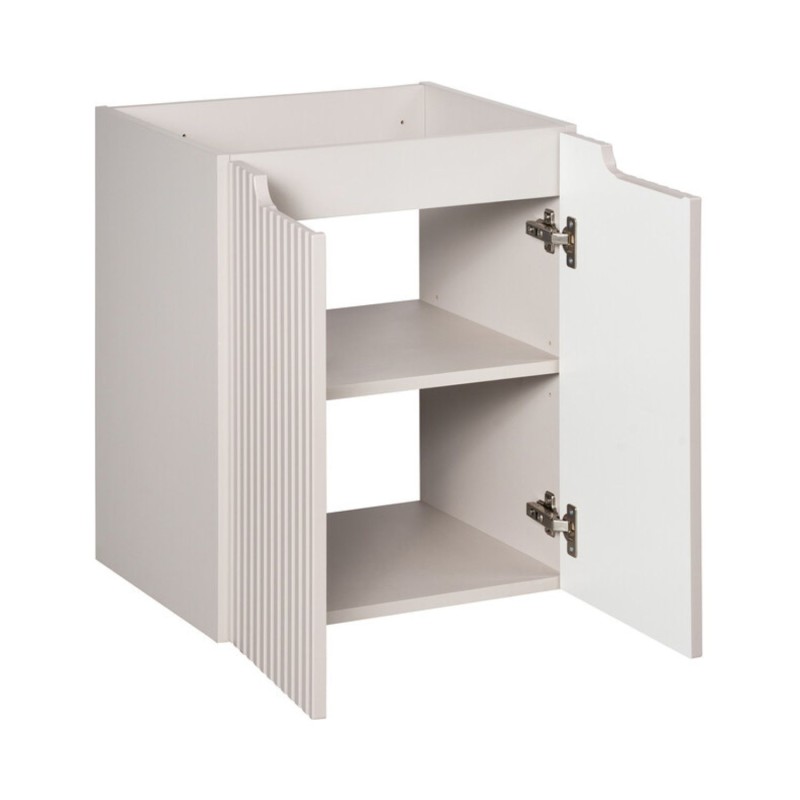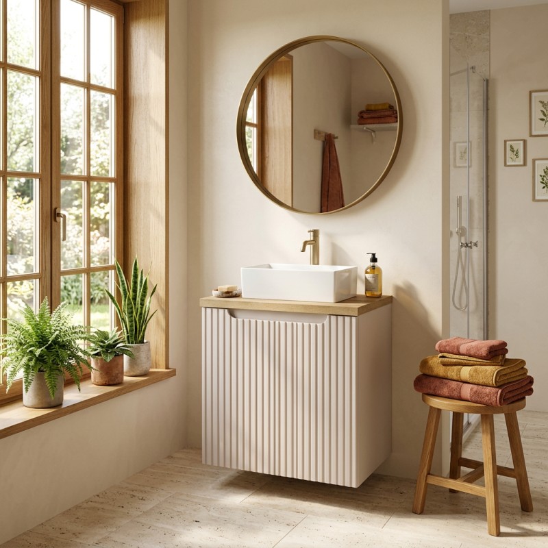Le meuble sous vasque suspendu en coloris cachemire se distingue par ses façades rainurées verticalement, apportant relief et élégance. Il est associé à un plan pour vasque en chêne clair, créant un contraste chaleureux et naturel.