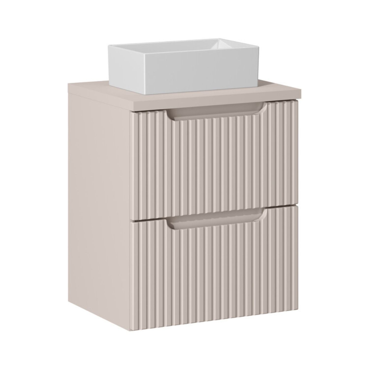 Le meuble sous vasque suspendu en coloris cachemire mat se distingue par ses façades rainurées verticalement, offrant un rendu contemporain et raffiné. Il est associé à un plan pour vasque assorti, créant un ensemble harmonieux et épuré.