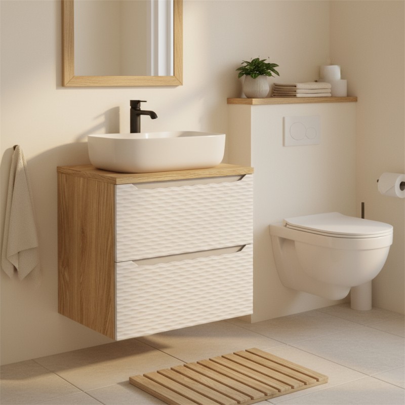 Conçu en panneaux MDF de haute qualité, ce plan vasque présente un aspect bois authentique et une texture raffinée. Il s’adapte aussi bien à une décoration contemporaine qu’à un style plus scandinave, et complète harmonieusement les meubles sous-vasques de la collection YOKA.