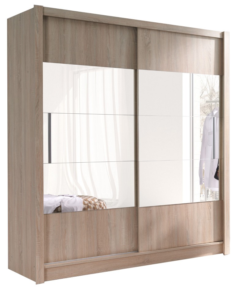 MODELO: Armario ROME - DIMENSIONES: L 180 x P 62 x H 200 cm - COLOR: Roble sonoma - ESTRUCTURA: Paneles de partículas, metal y MDF de primera calidad - MATERIAL DEL REVESTIMIENTO: Papel decorativo - TIPO: Escandinavo, diseño, moderno y de tendencia - COMPOSICIÓN: 2 puertas correderas con espejo. El interior está equipado con un armario y estanterías. - ENSAMBLAJE: Fácil gracias al manual de montaje. Este armario será práctico para optimizar el almacenamiento de toda su ropa. Es adecuado para niños y adultos.