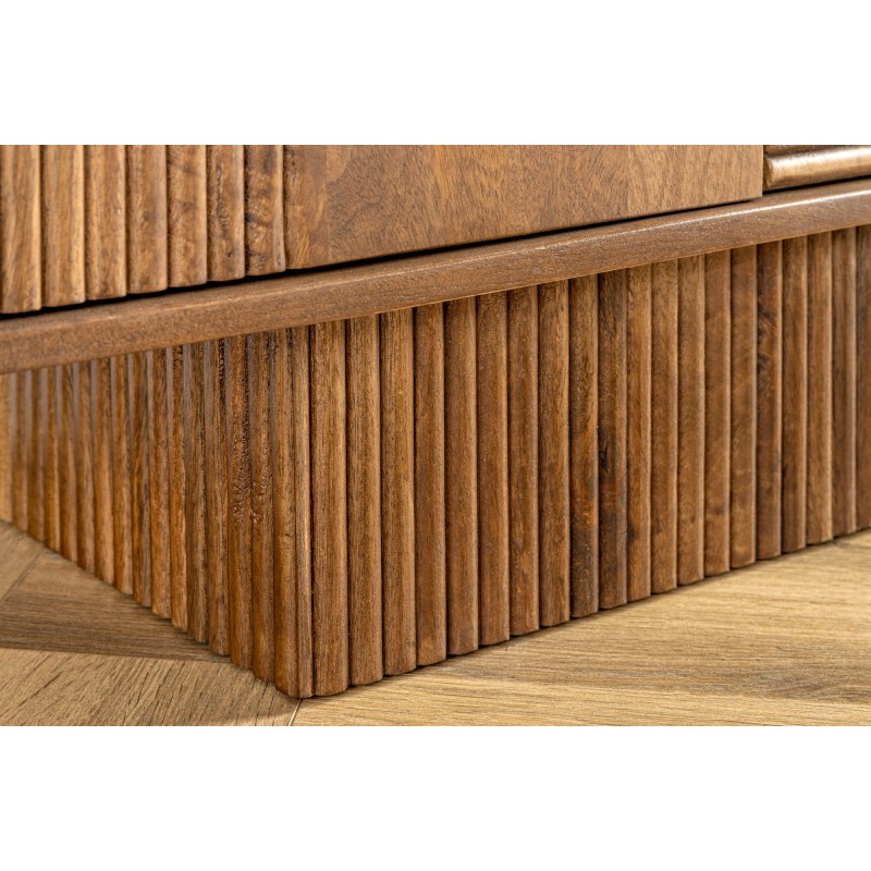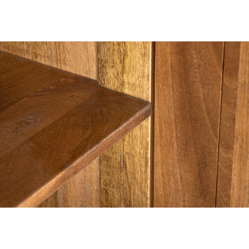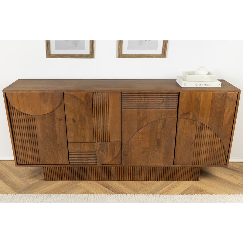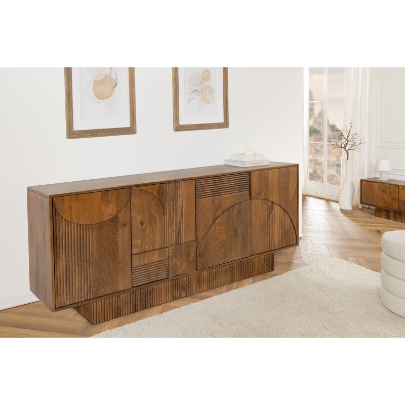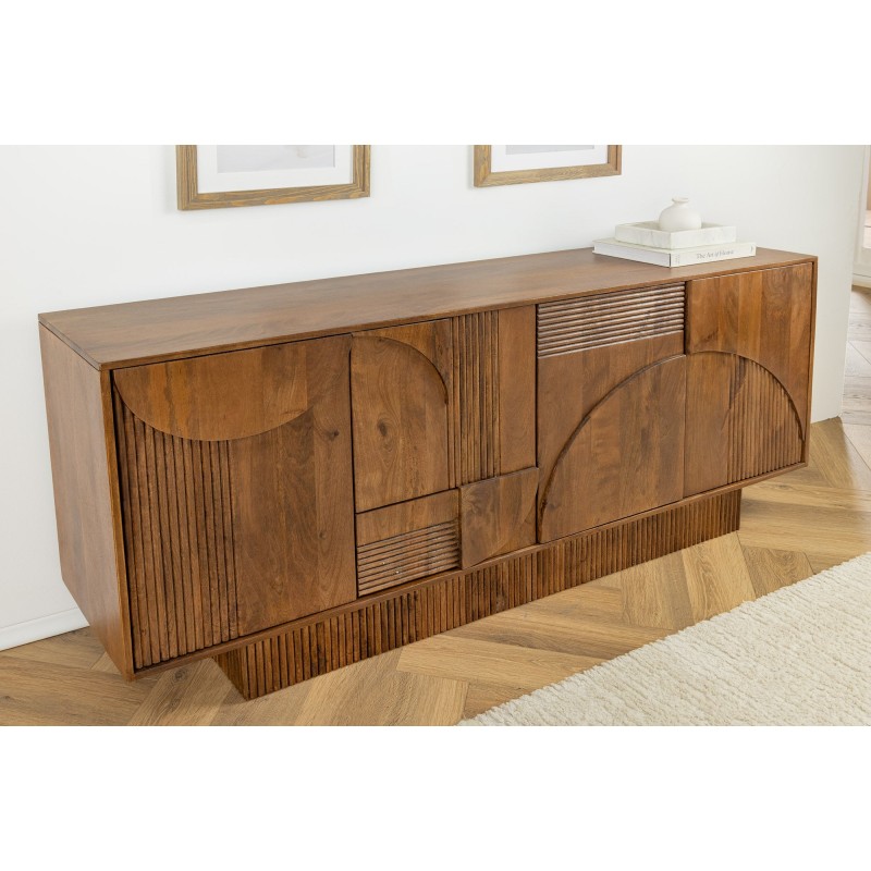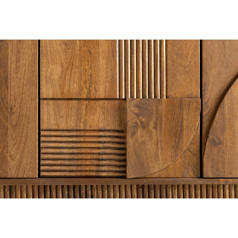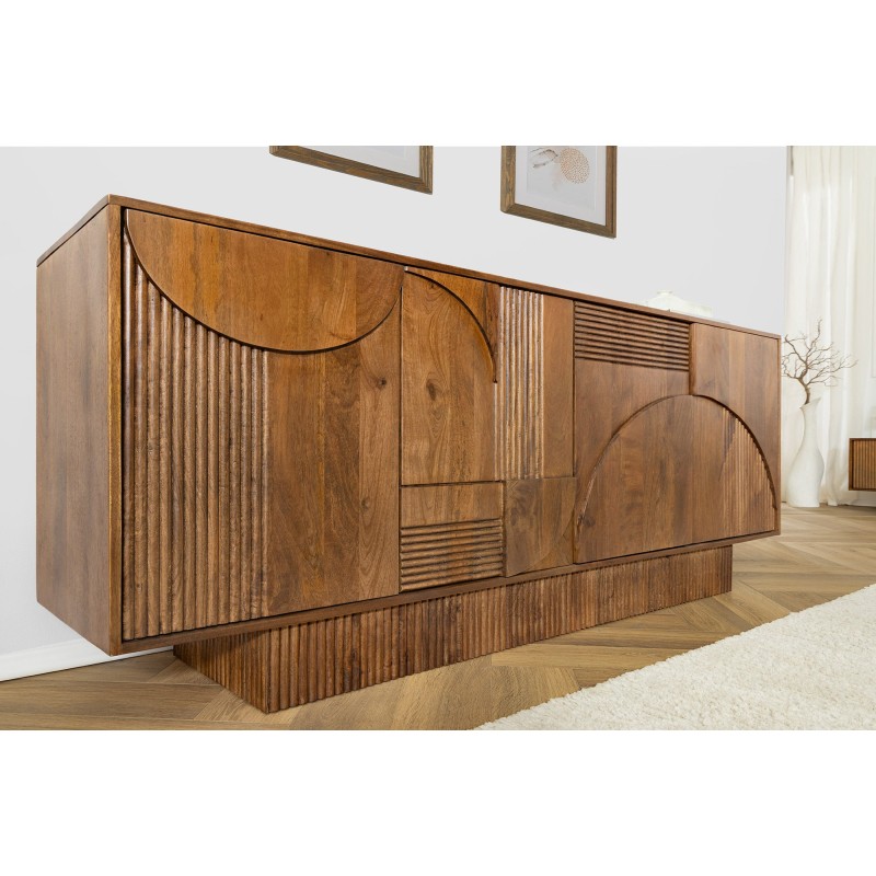 Le buffet ORINO 170 cm incarne à la fois la rigueur du design graphique et l’authenticité de l’artisanat. Ses formes géométriques sculptées et ses détails rainurés apportent du relief et une dimension artistique à ce meuble, sublimé par une finition bois fumé chaleureuse et raffinée.