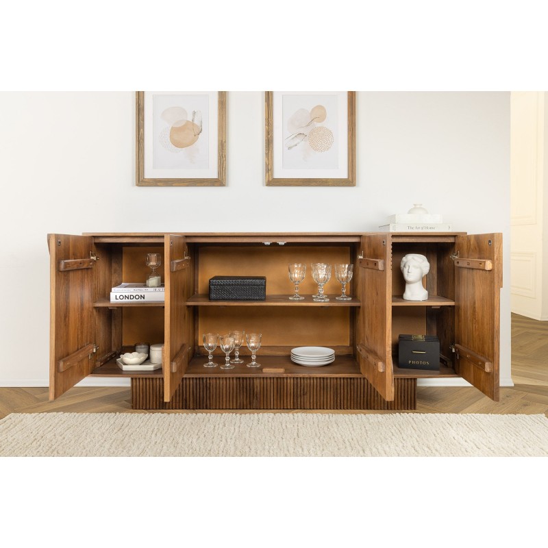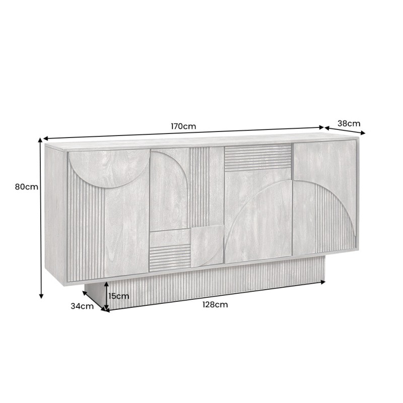 Ce buffet bas 4 portes offre une grande capacité de rangement, grâce à ses 3 étagères intérieures permettant d’organiser vaisselle, verres, linge de maison ou objets du quotidien. Conçu en bois massif sculpté, il allie robustesse et esthétisme, faisant de lui une pièce maîtresse dans une salle à manger ou un salon contemporain.