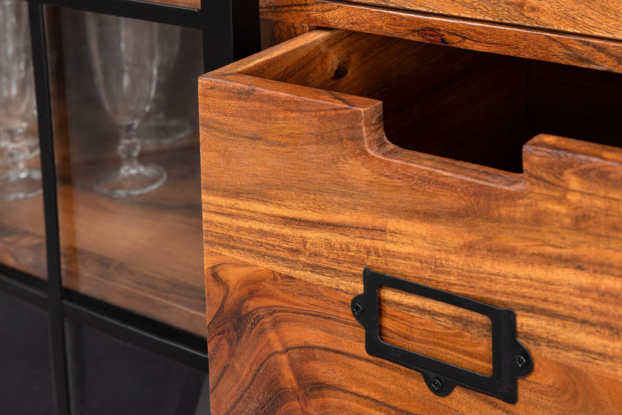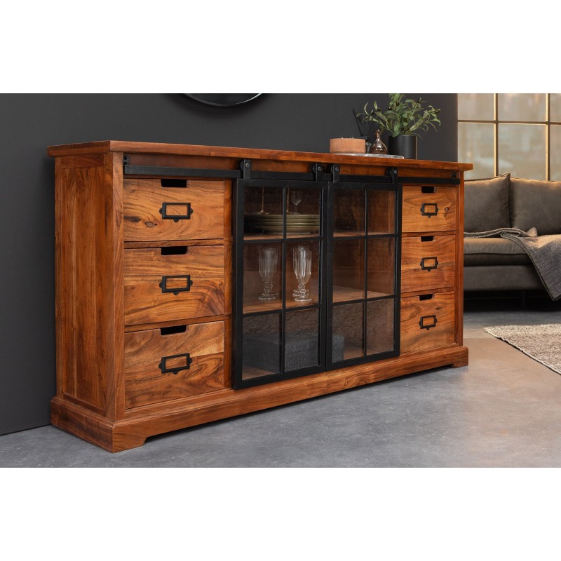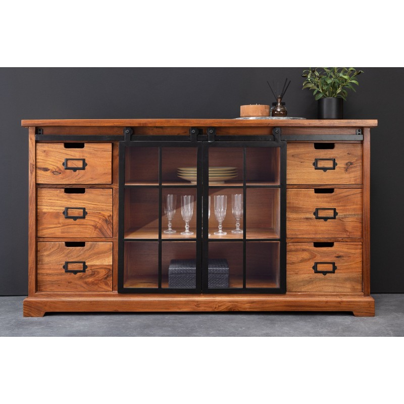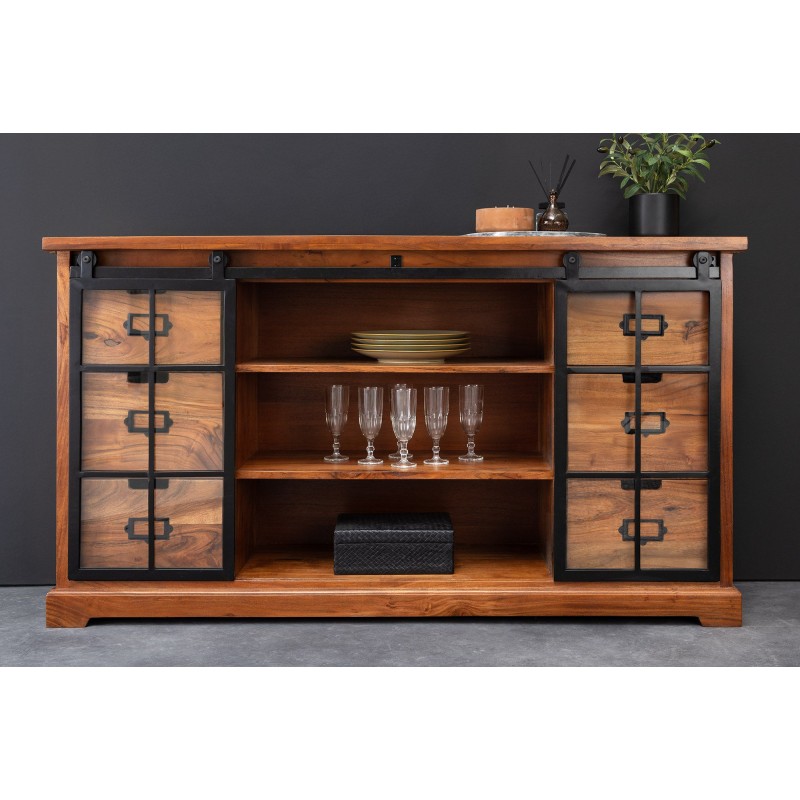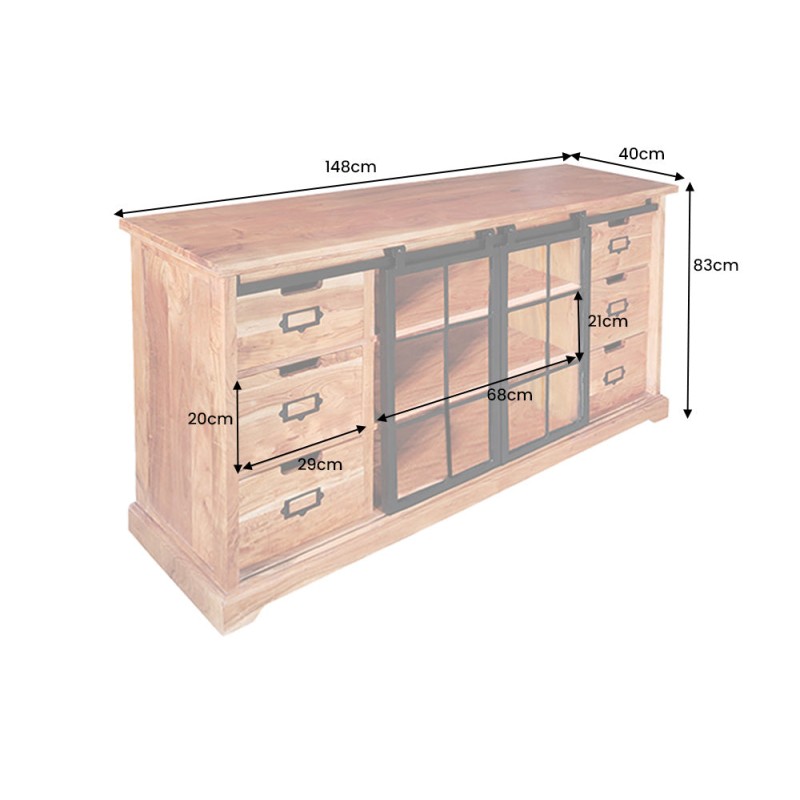 Ce buffet LUMBER 150 cm s’inscrit dans la continuité du meuble TV de la même collection, confirmant l’identité cohérente de cette gamme au style atelier industriel vintage. Il associe le bois massif d’acacia à des portes coulissantes vitrées façon verrière et des poignées étiquettes en métal noir, pour un rendu à la fois authentique, pratique et résolument tendance.