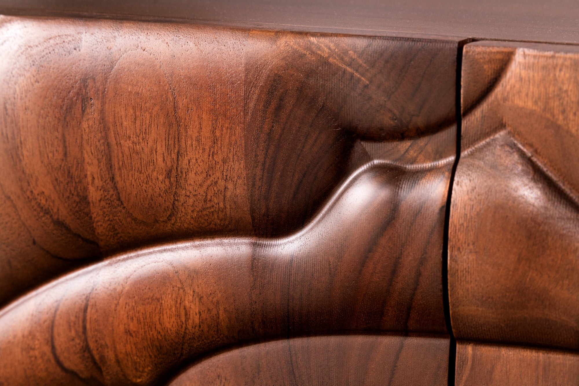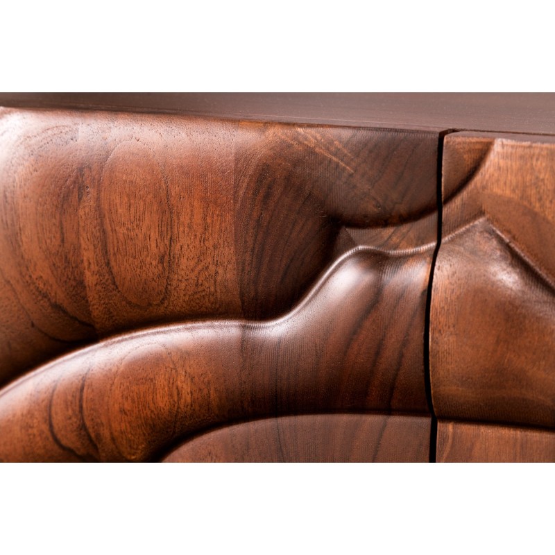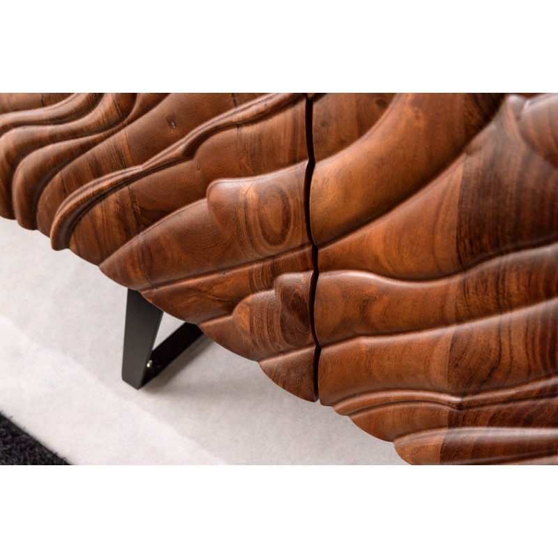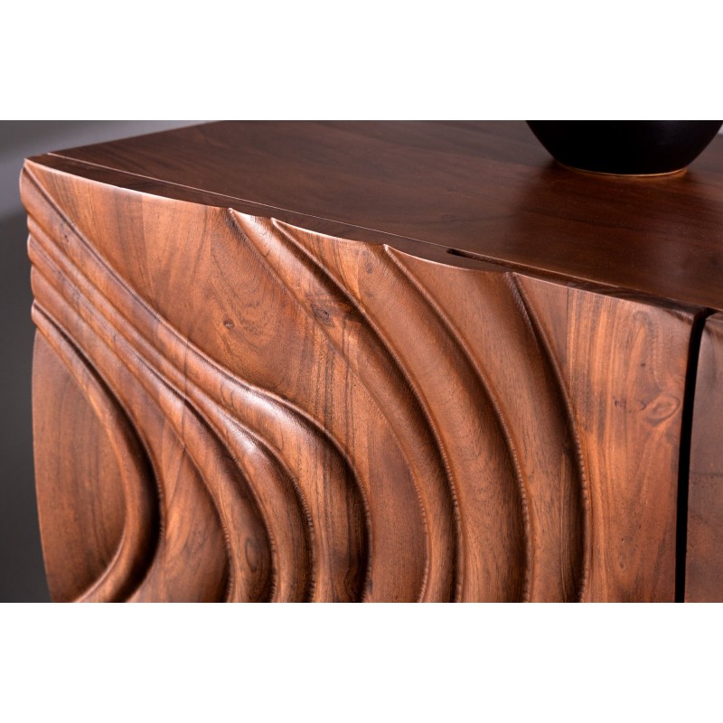 Le buffet GAÏA 175 cm séduit par son design spectaculaire et organique. Réalisé en bois massif d’acacia, il dévoile des façades sculptées en 3D qui évoquent des ondulations naturelles ou des striures minérales. Sa finition noyer brun foncé apporte chaleur et élégance à votre intérieur, tout en affirmant un style moderne et haut de gamme.