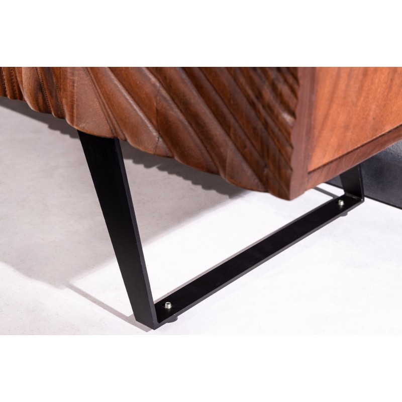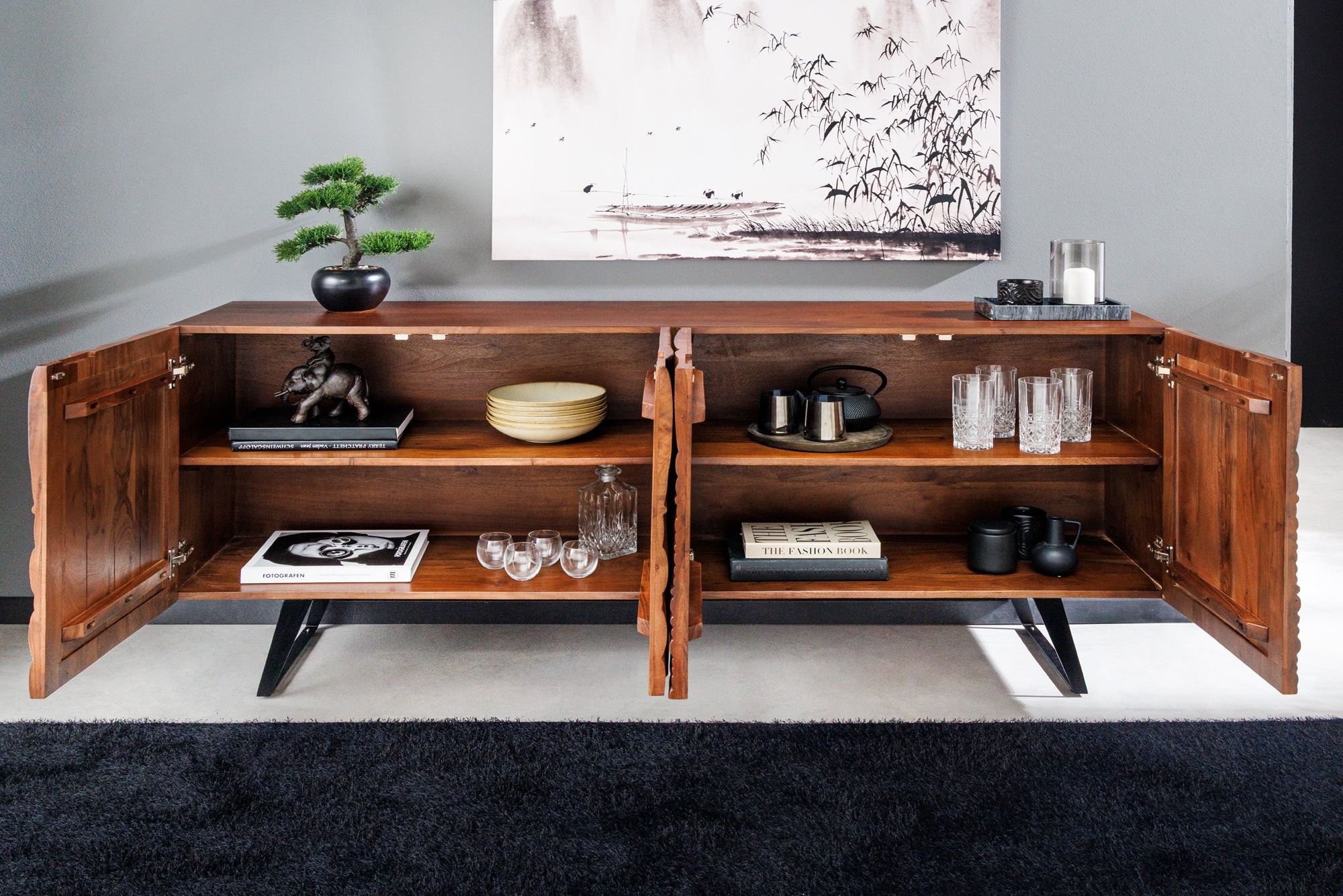 Doté de 4 portes battantes et de 2 étagères intérieures, ce buffet offre un vaste espace de rangement tout en incarnant une véritable pièce décorative. Sa structure robuste en bois massif associée à des détails en métal souligne son esprit à la fois contemporain et authentique.