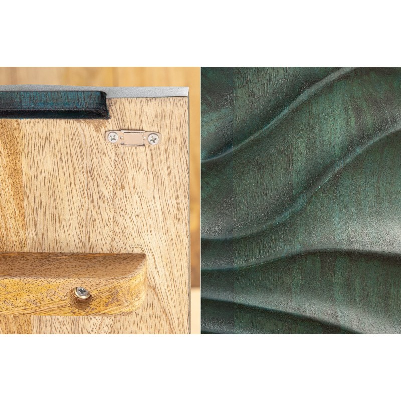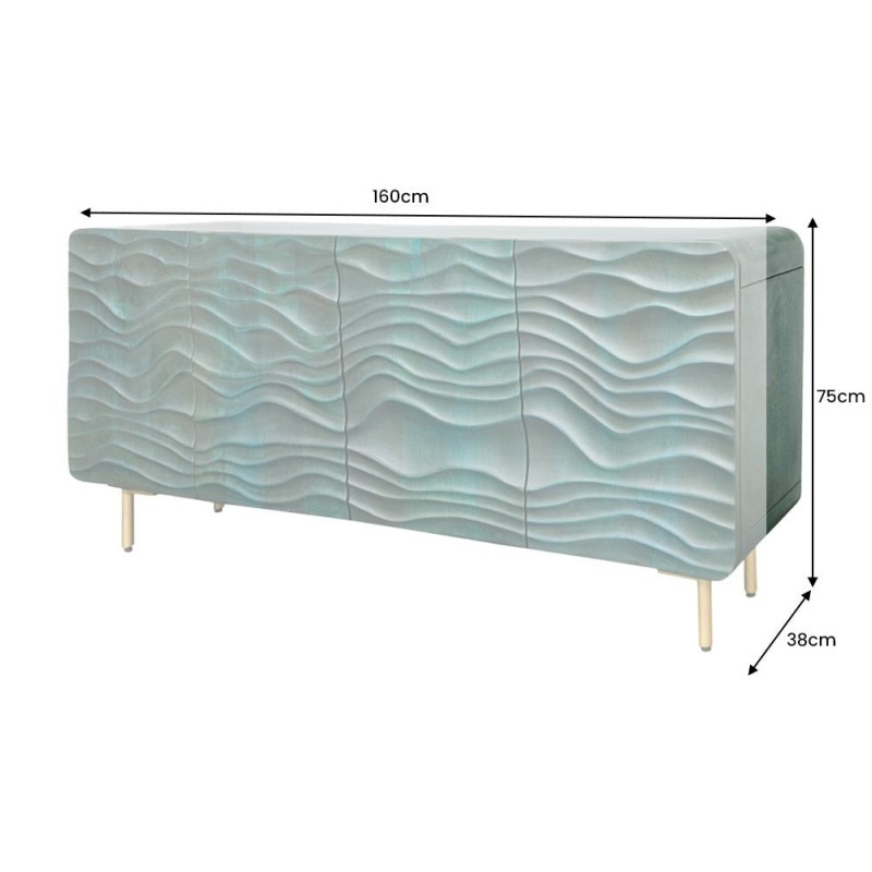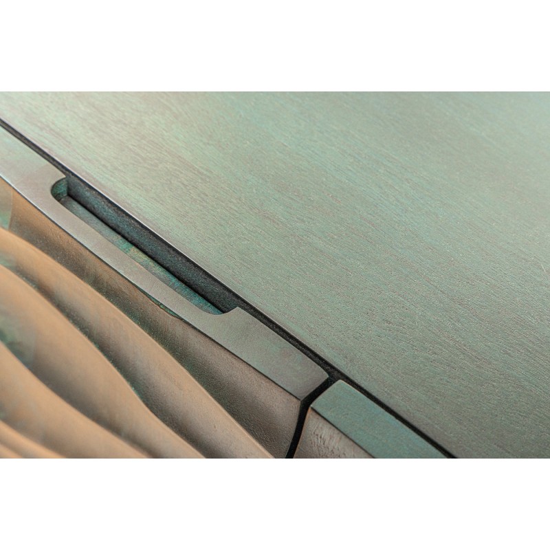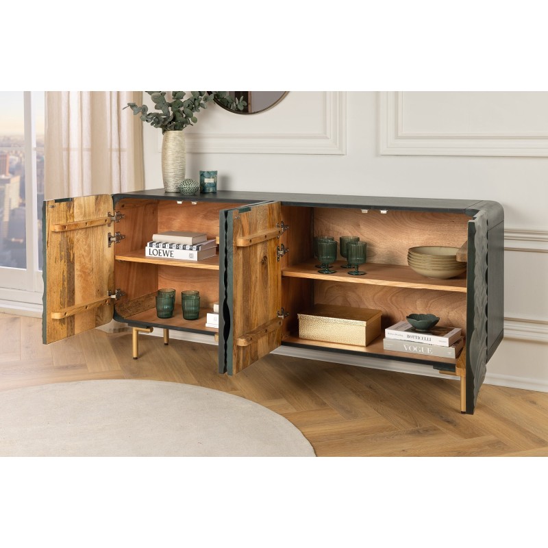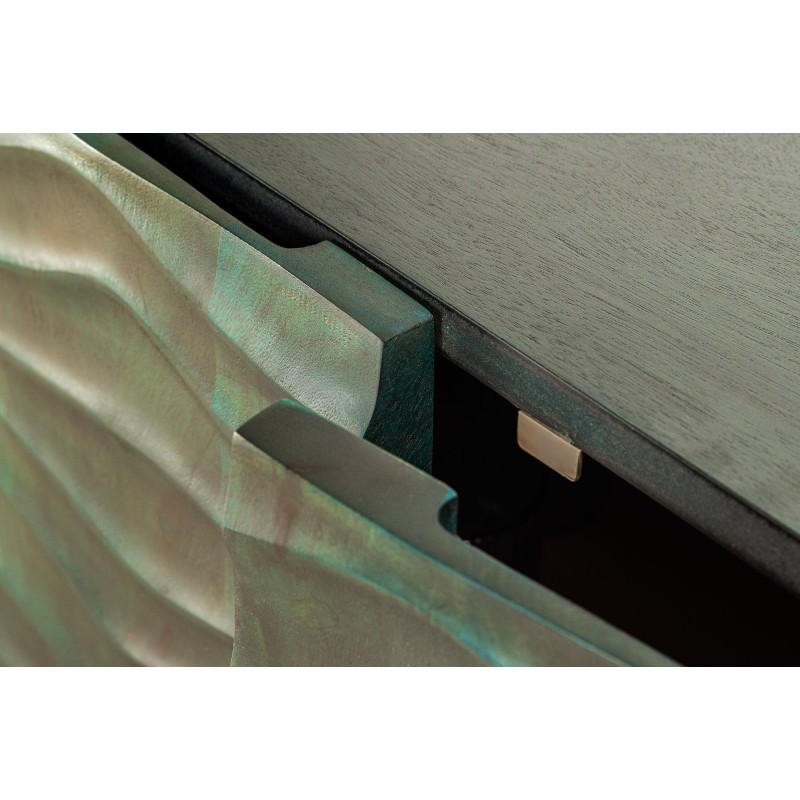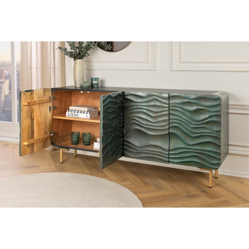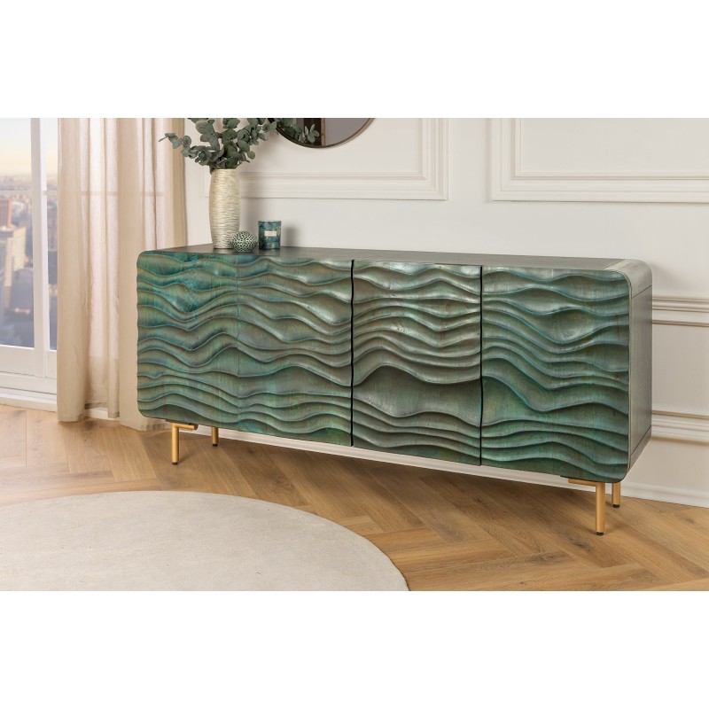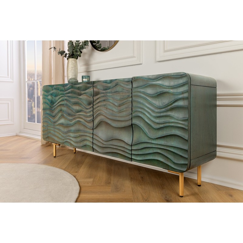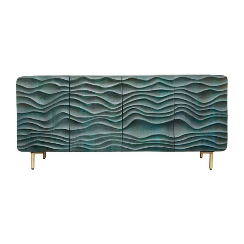 Ce buffet évoque l’océan, les vagues, la brise et les paysages aquatiques sculptés dans le bois. Le relief ondulé en façade, combiné à cette patine vert-de-gris subtile et ses pieds dorés, en fait un meuble à l’esprit organique, artistique et contemporain.