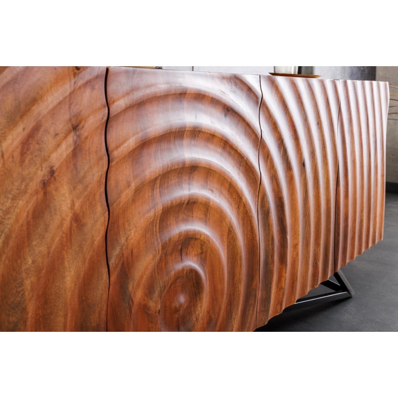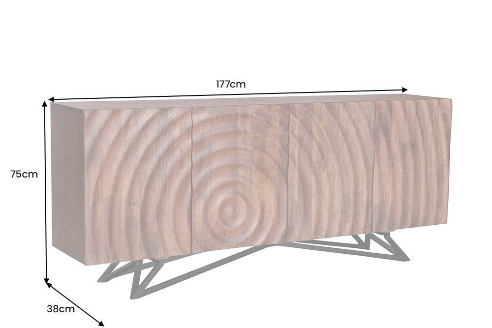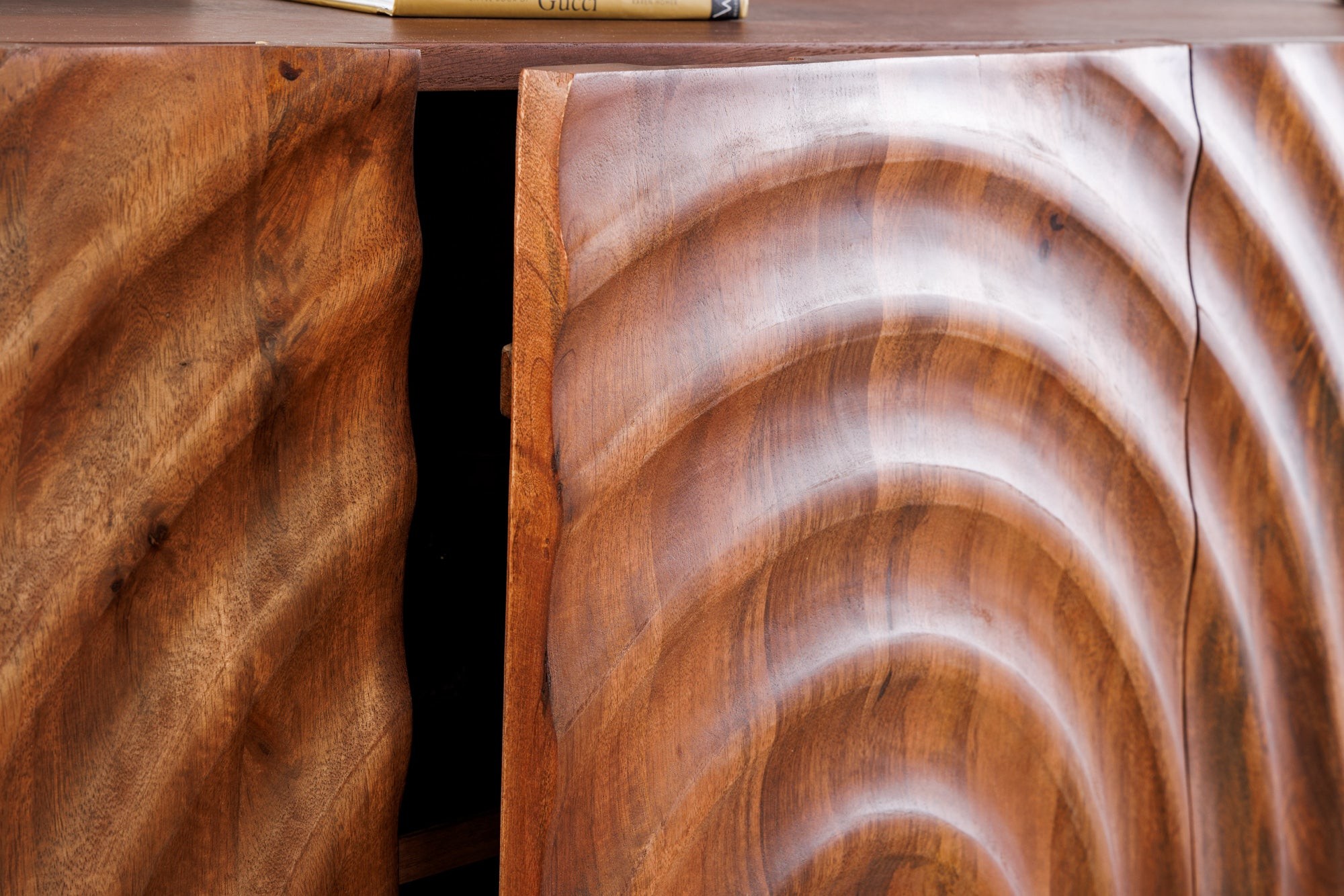 Alliant naturel et modernité, le buffet ONDARA 180 cm séduit par sa façade en bois massif de manguier sculpté en relief 3D. L’effet ondulation, qui rappelle les cercles formés à la surface de l’eau, évoque à la fois le mouvement, la fluidité et l’authenticité. Ce design organique unique s’associe à une base en métal noir graphique, pour un rendu résolument contemporain.